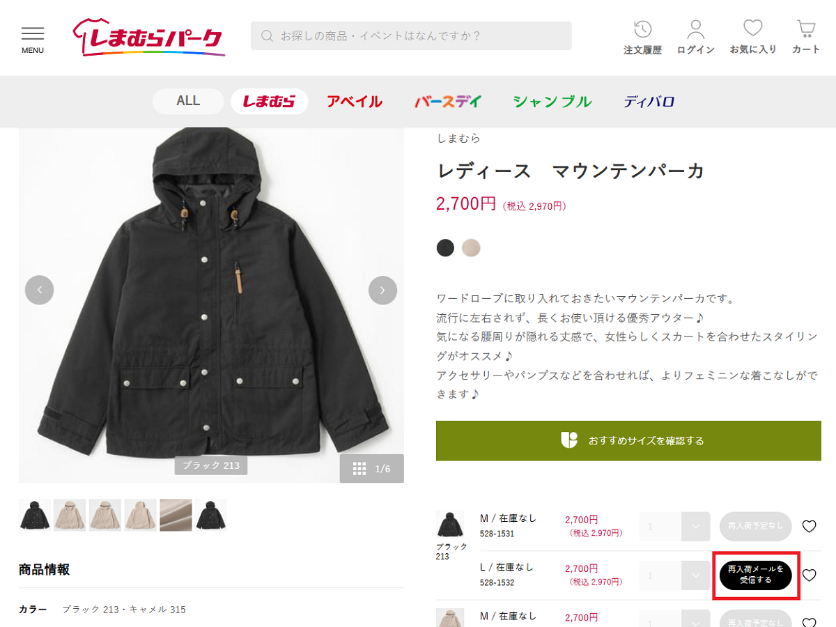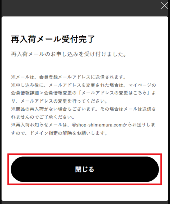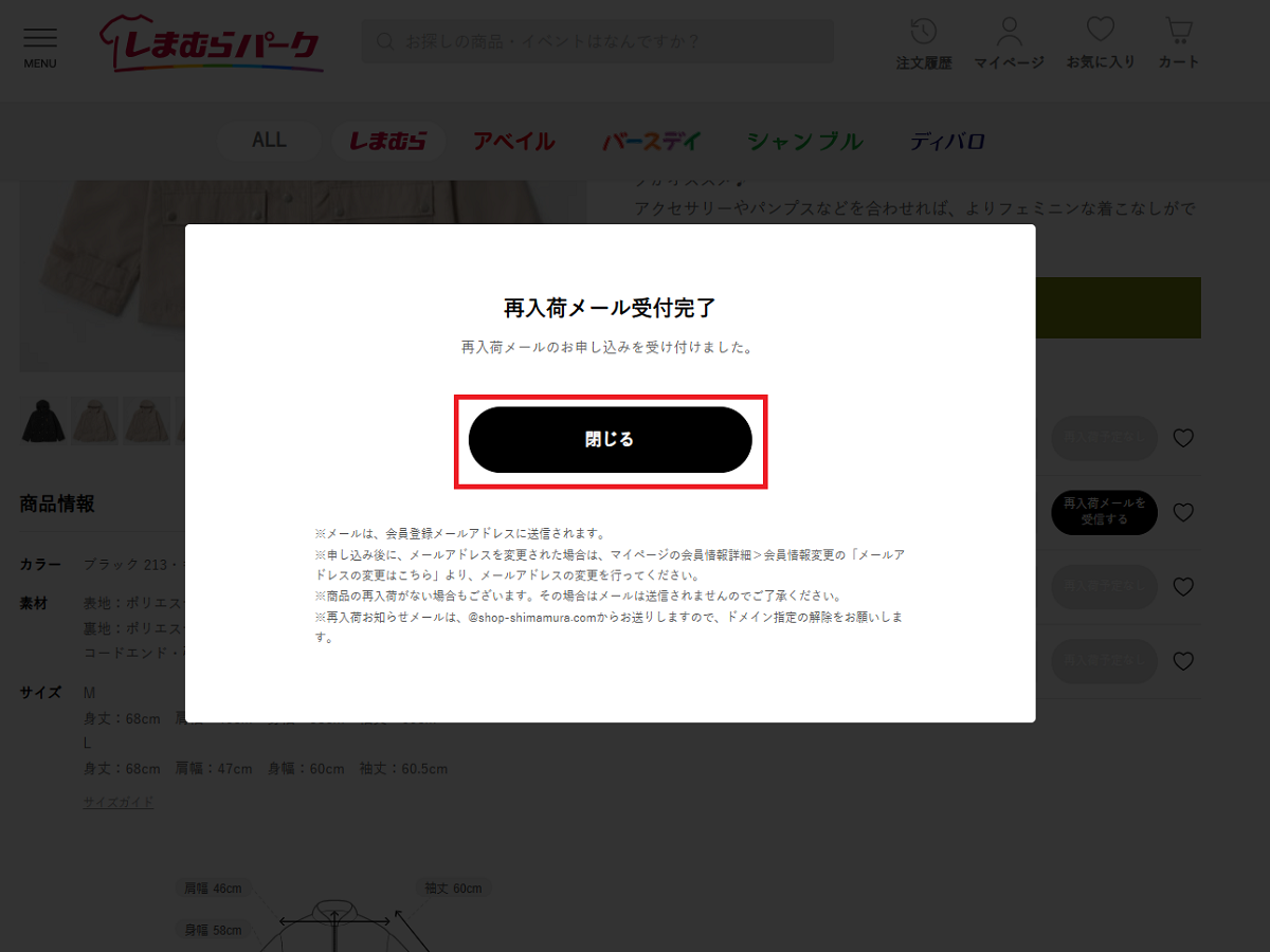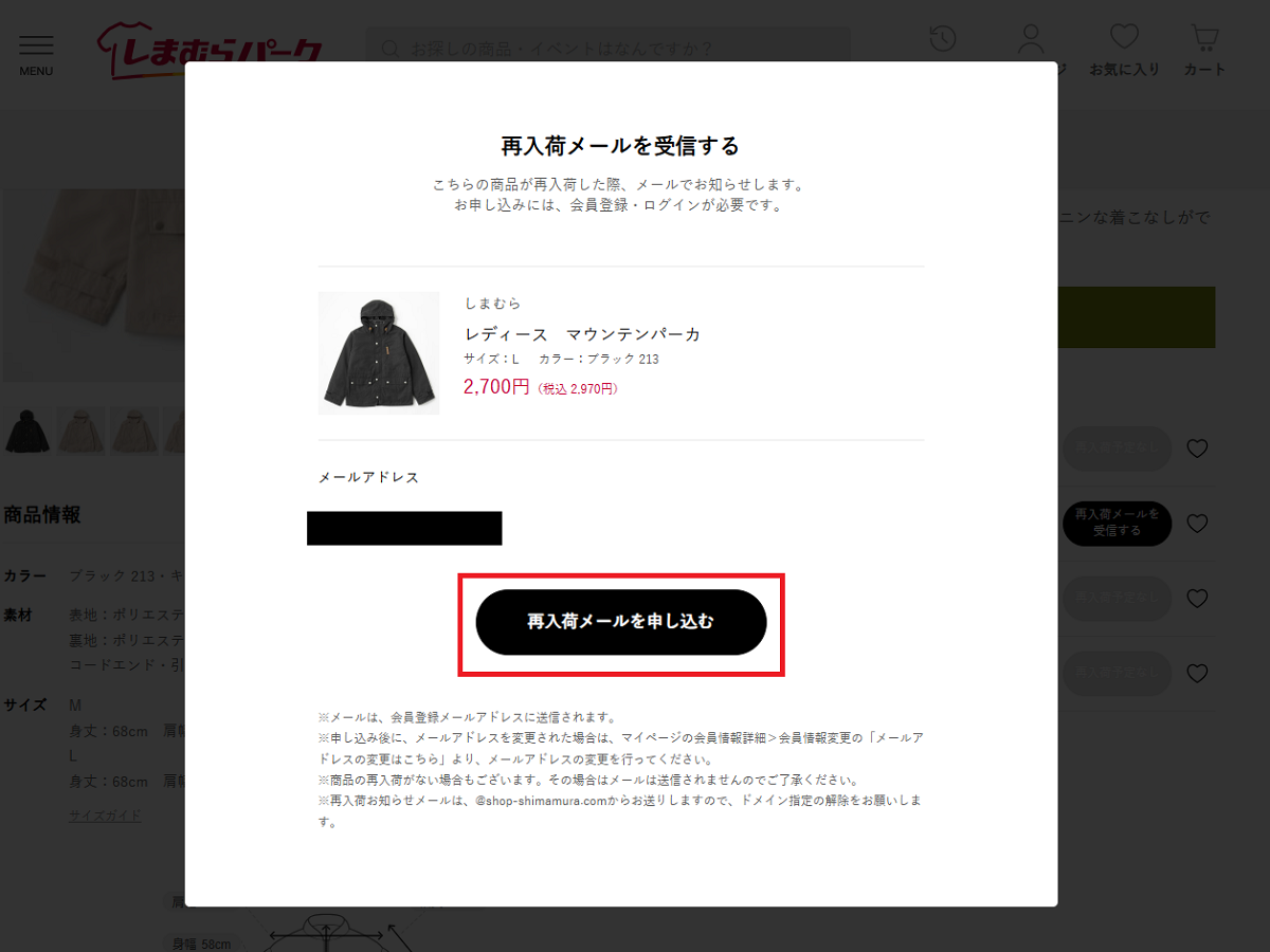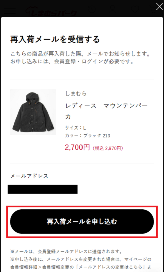 ドメイン指定をされている場合は、下記を受信できるようにご登録ください。- 会員登録・会員情報変更、会員特典に関するメール「@member.shop-shimamura.com」