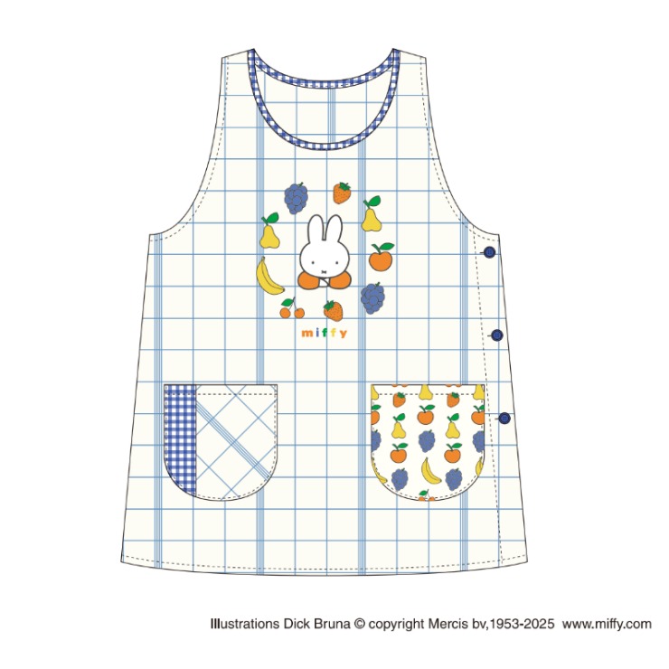 MIFFYのエプロンです。MIFFYとフルーツがデザインされたとてもかわいいアイテムです。サイドボタンで着脱しやすい仕様になっています。