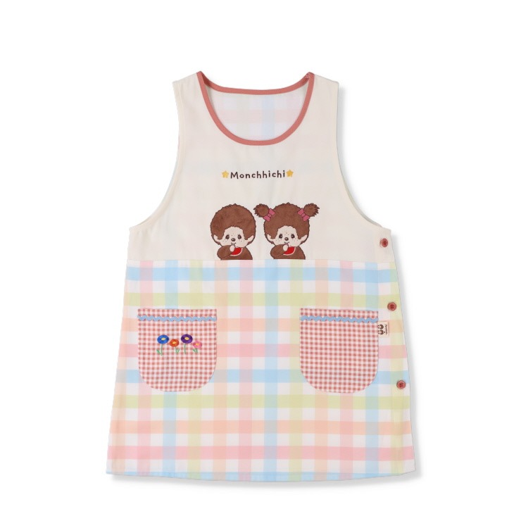 モンチッチくんとモンチッチちゃんのアップリケエプロン。ポケットにお花の刺しゅう付き。サイドボタンで着脱ラクチン設計。