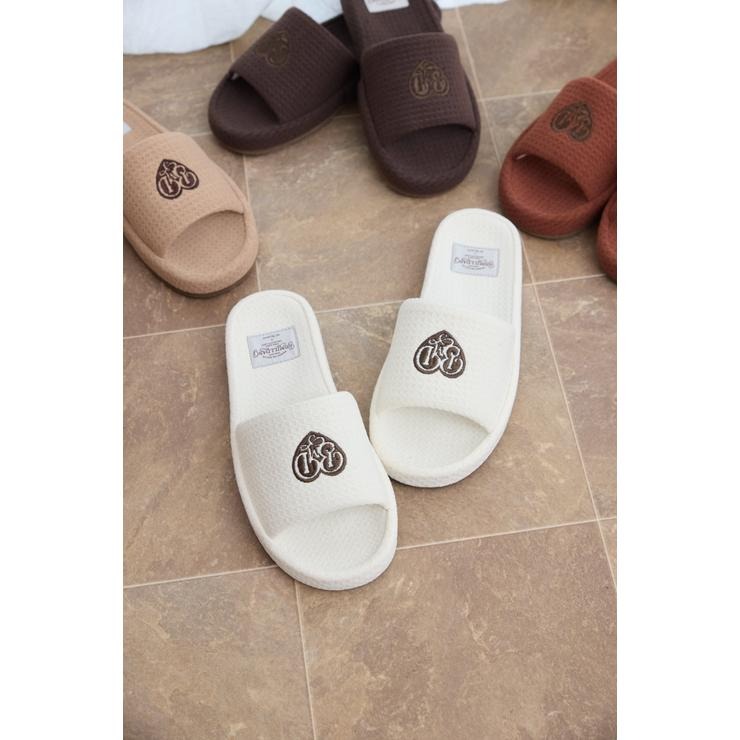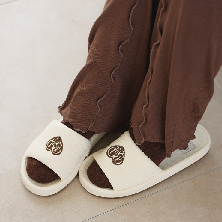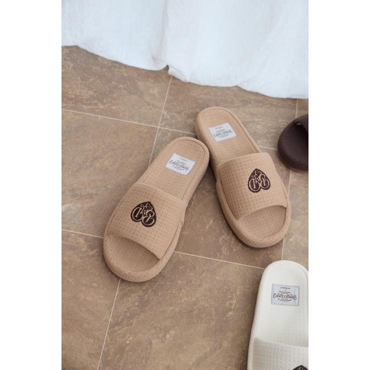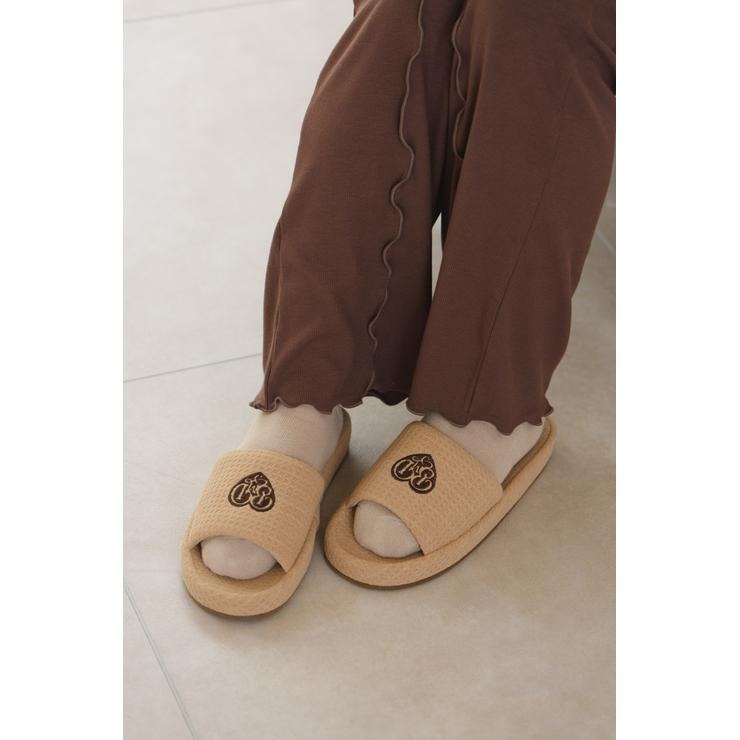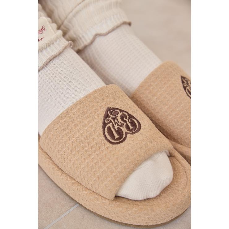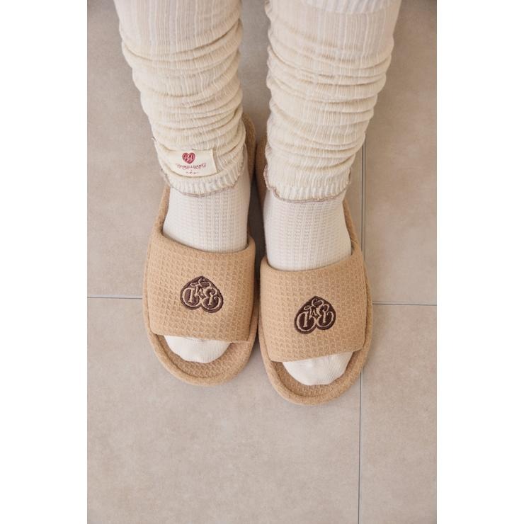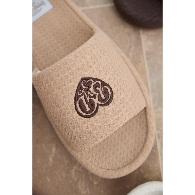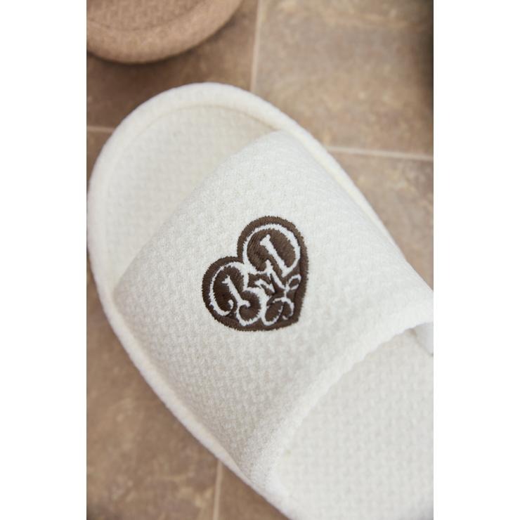 ワッフル風素材を使用した、心地よい肌ざわりのスリッパです。インテリアに馴染む、ナチュラルで優しいカラー展開。ハートのロゴの刺繍と、足元がすっきり見えるシルエットがポイント。