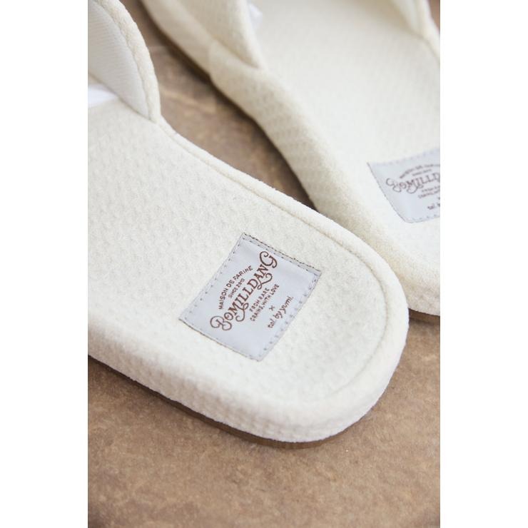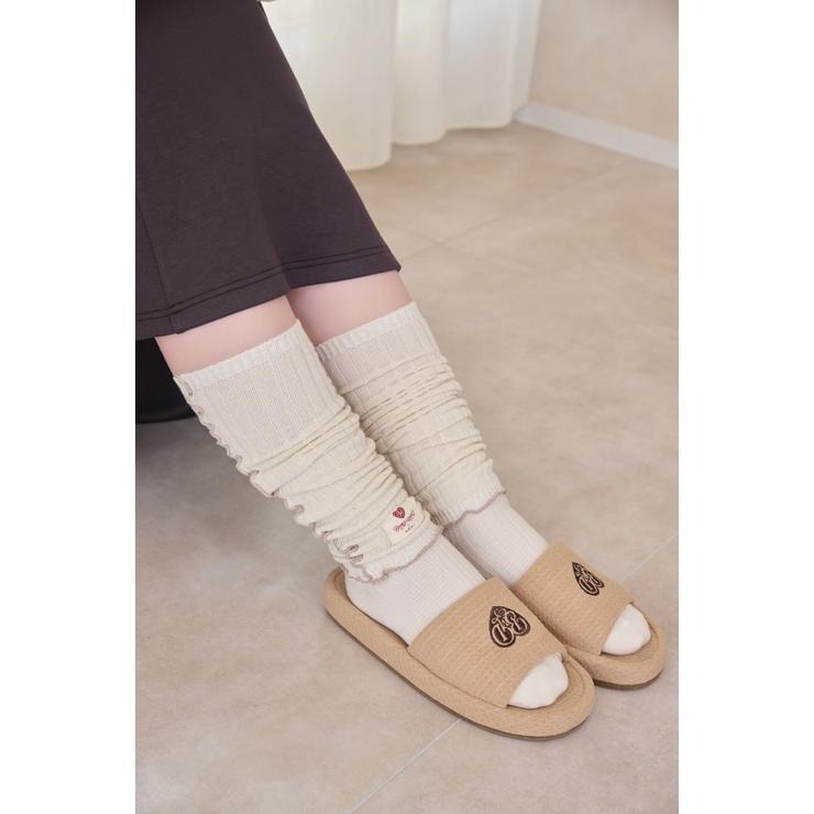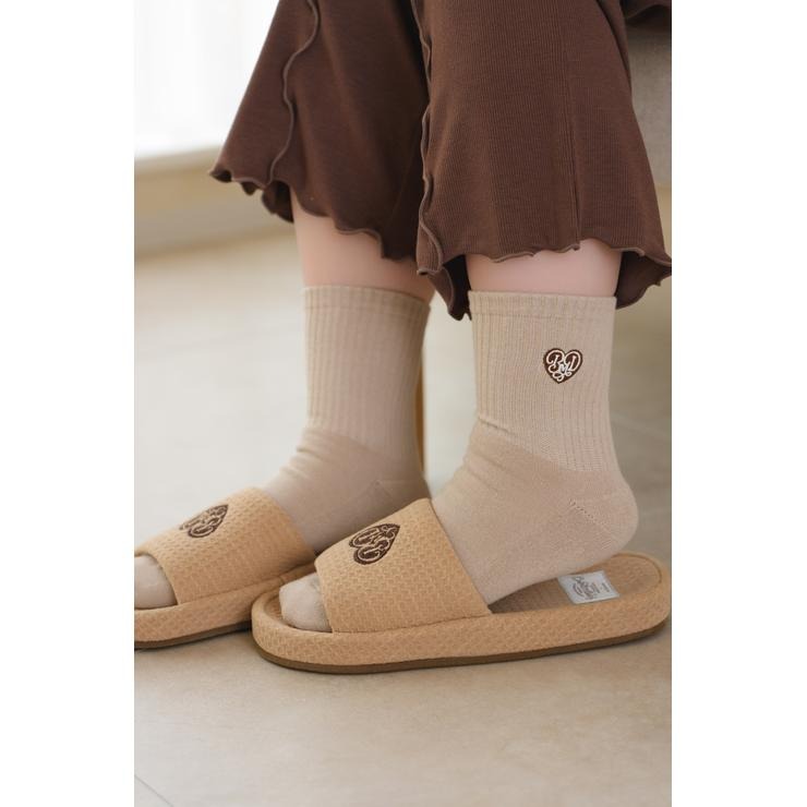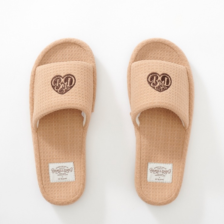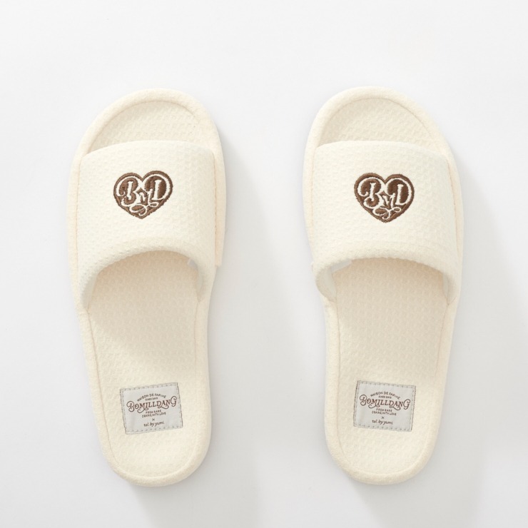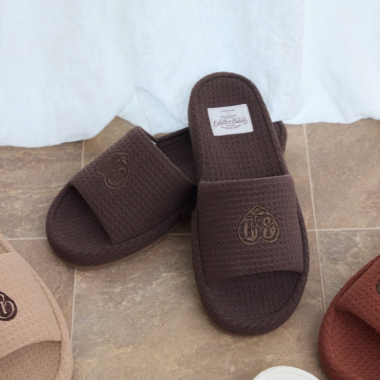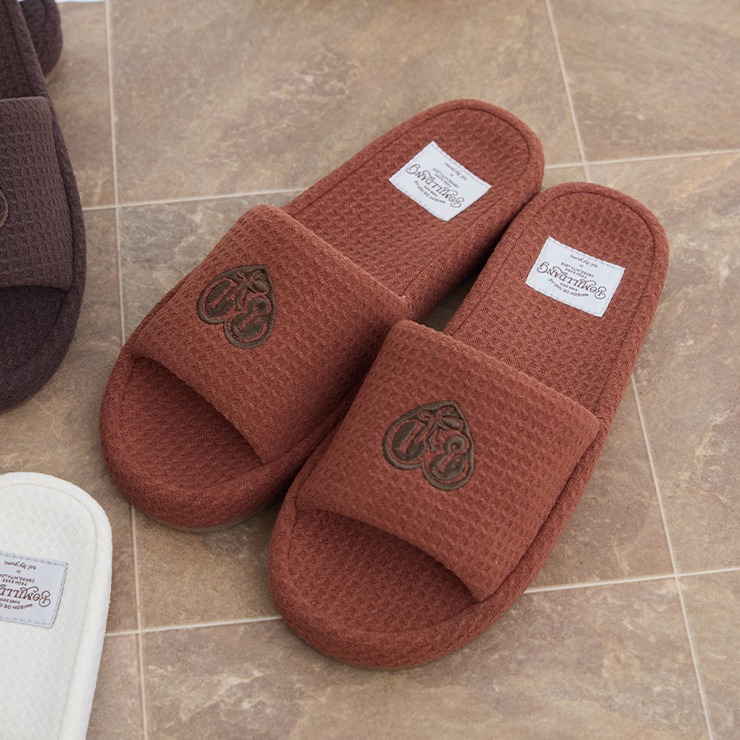 ワッフル風素材を使用した、心地よい肌ざわりのスリッパです。インテリアに馴染む、ナチュラルで優しいカラー展開。ハートのロゴの刺繍と、足元がすっきり見えるシルエットがポイント。