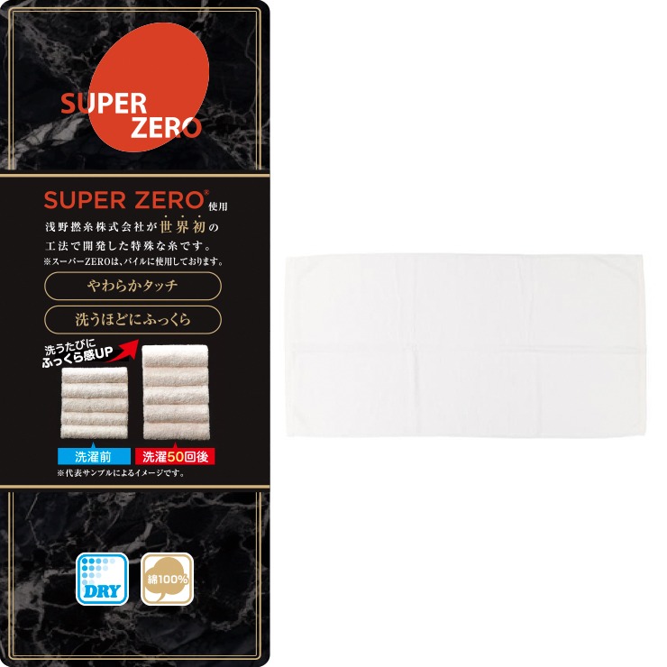 洗うほどにふっくら感UP!肌も髪も優しくなでるだけで吸水するタオル。浅野撚糸株式会社が世界初の工法で開発した特許製法の糸「SUPER ZERO」をパイルに使用し、吸水性とふんわり柔らかな肌触りを両立。