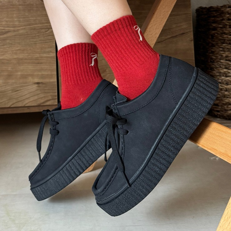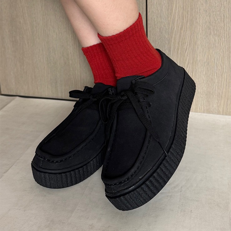 プラットフォームの厚底ソールが印象的なチロリアンデザインのシューズです。スカートにもパンツにも合わせやすいデザインで、ソール部分に適度なボリューム感を持たせる事で、トレンド感もさることながら自然な脚長効果も期待できます。高低差が少ないので安定感があり歩きやすさも◎