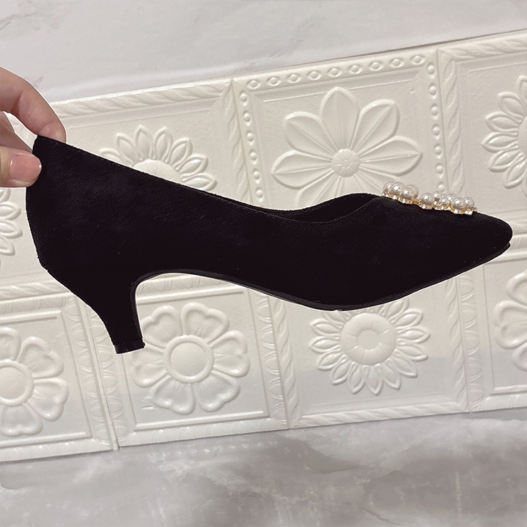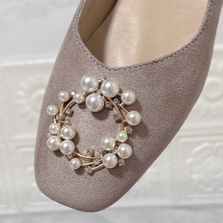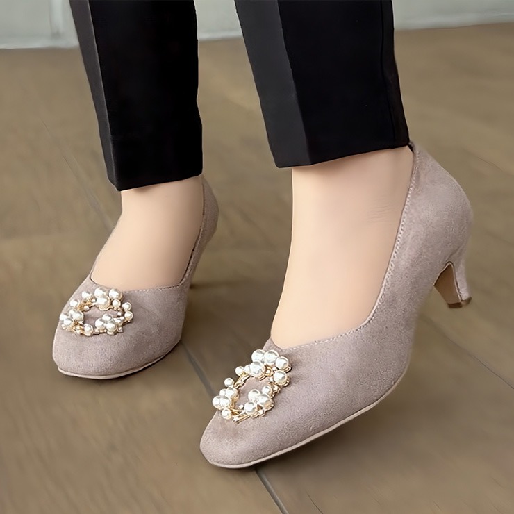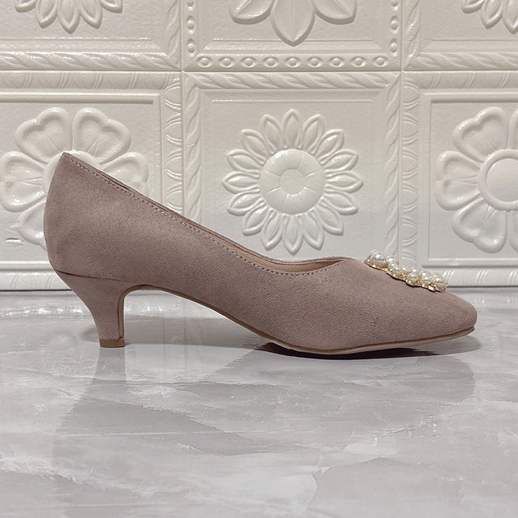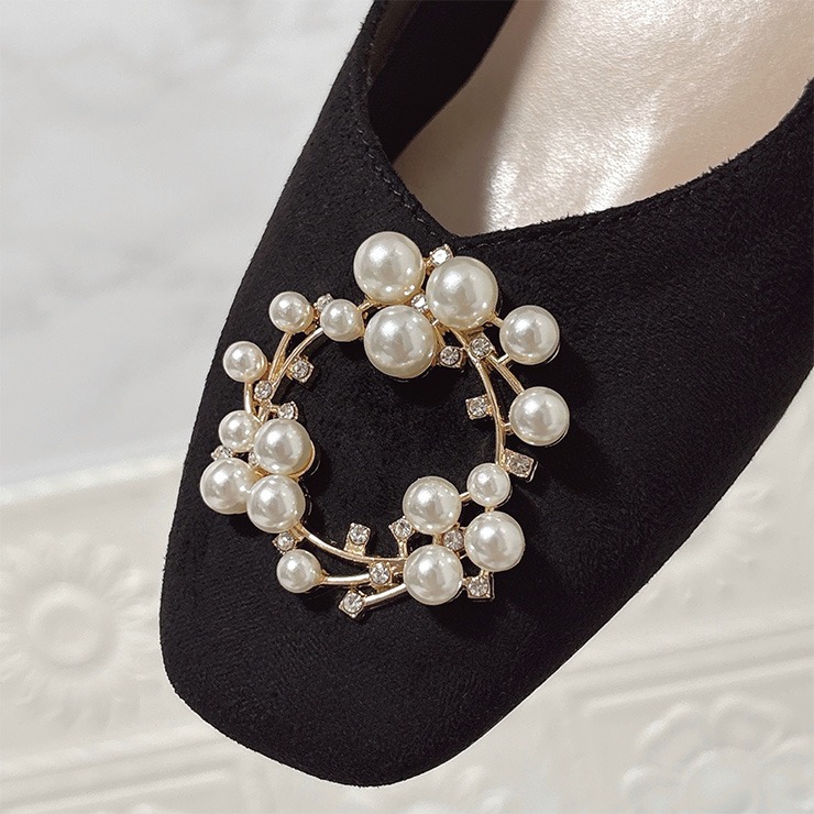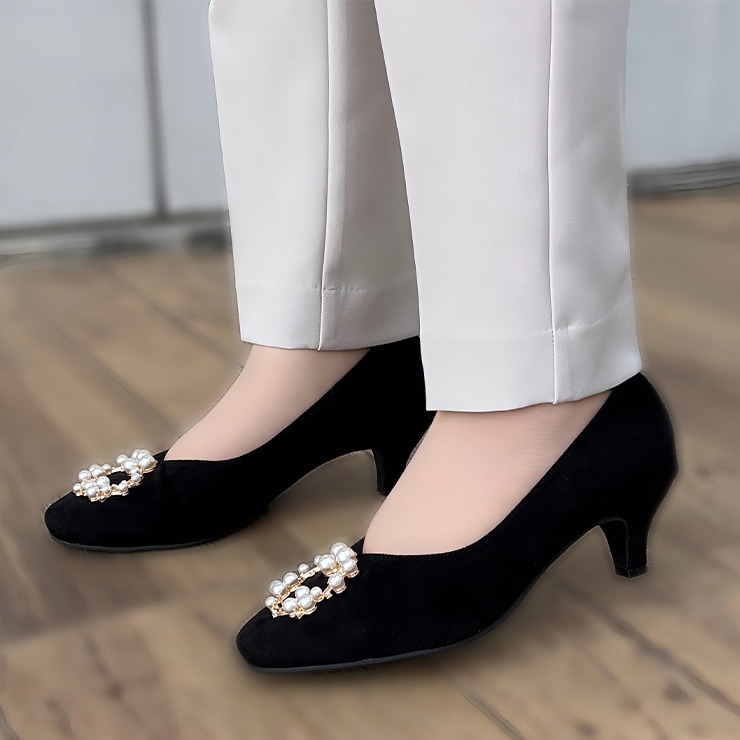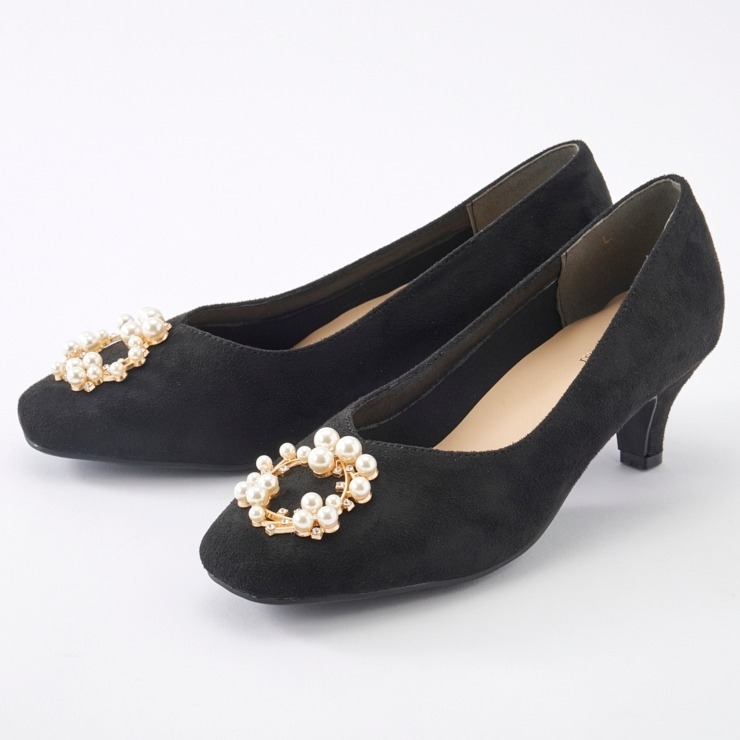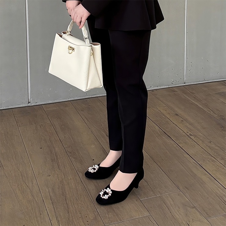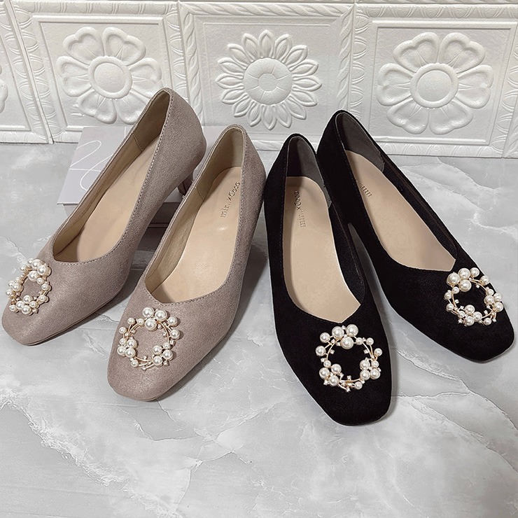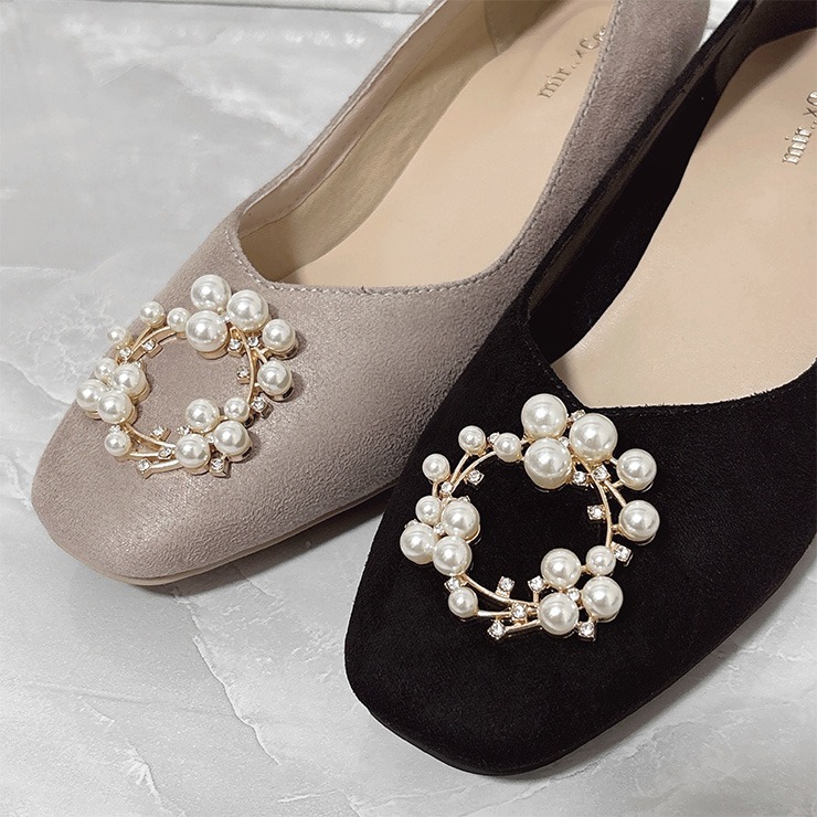 大人可愛いスクエアトゥにパールリボンがエレガントなパンプスです。