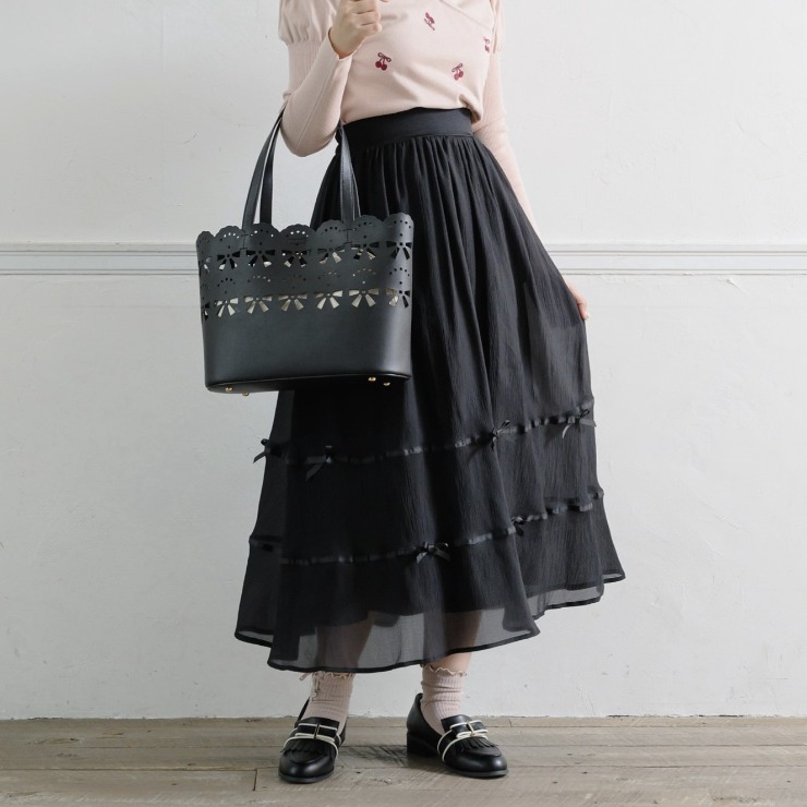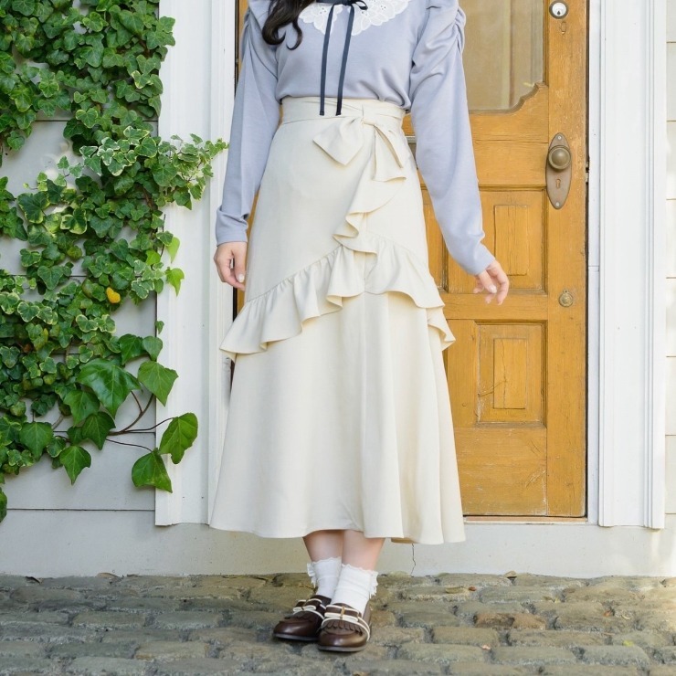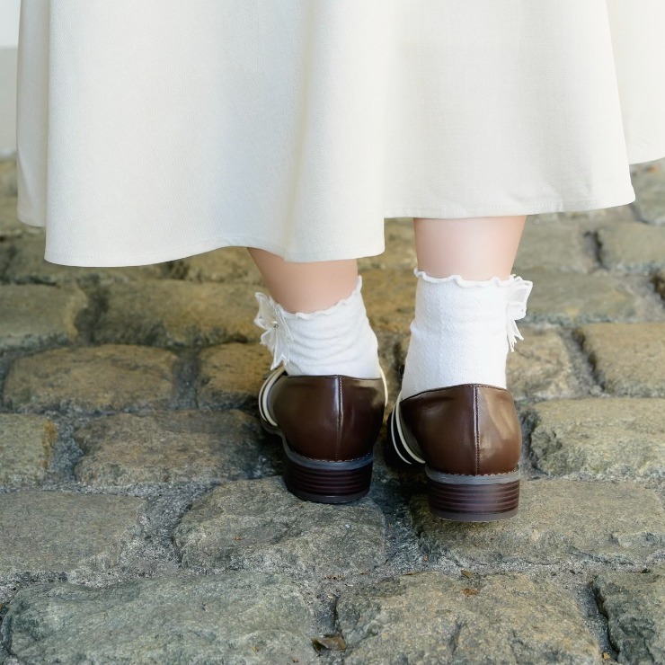 リボンは幅広シルエットだから、甘すぎず大人っぽく履けるのが魅力。真ん中の金具がほどよいアクセントになって、足元をすっきりおしゃれに見せてくれます。