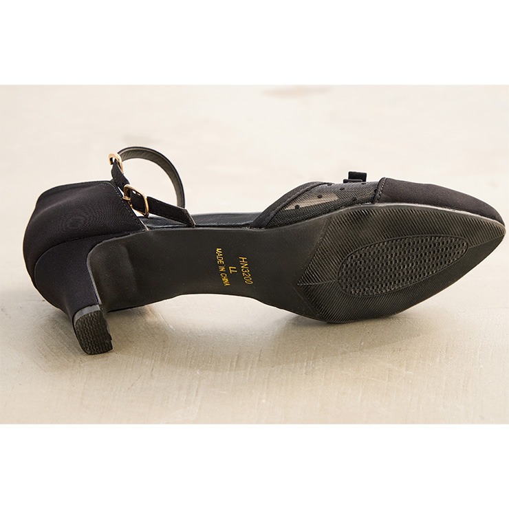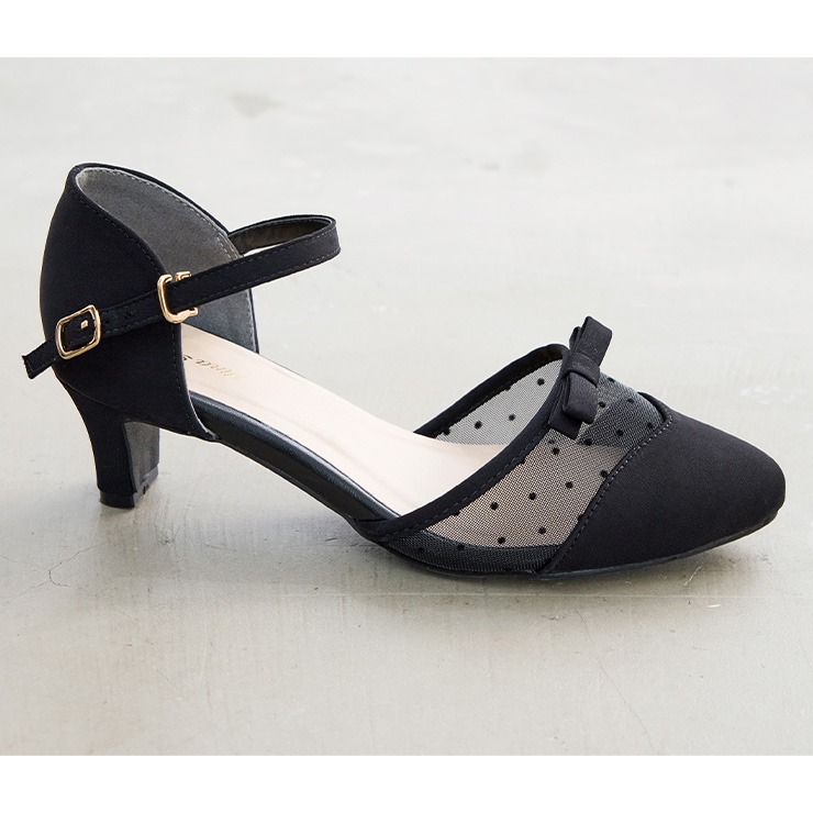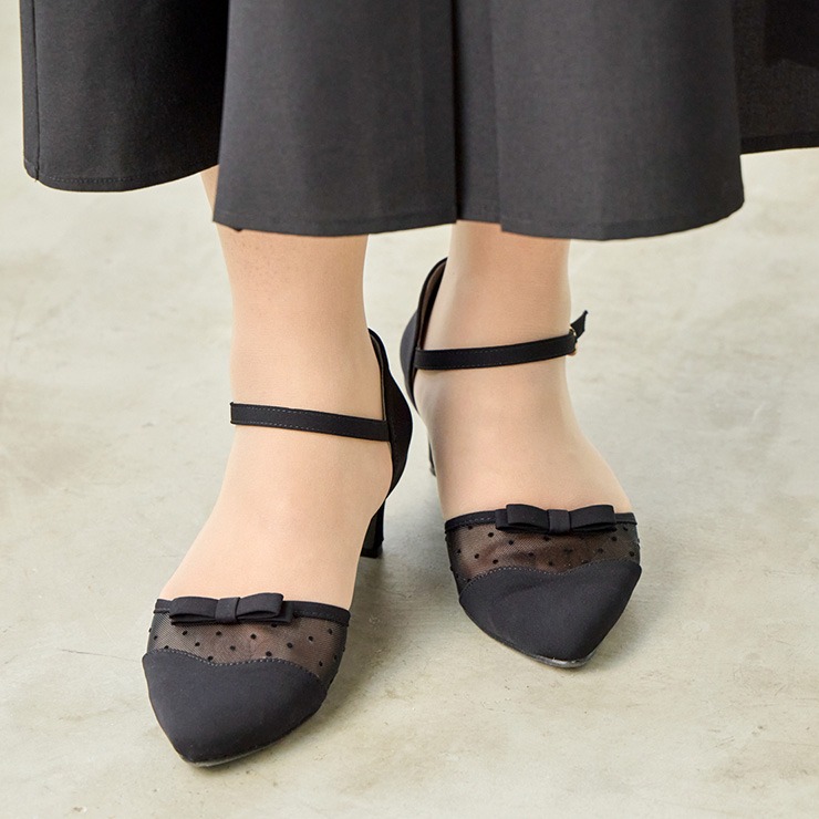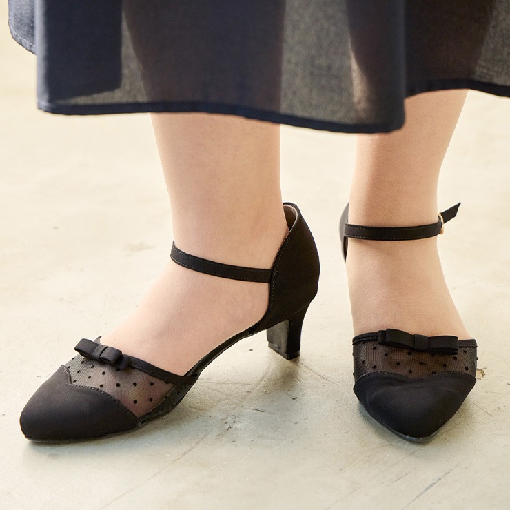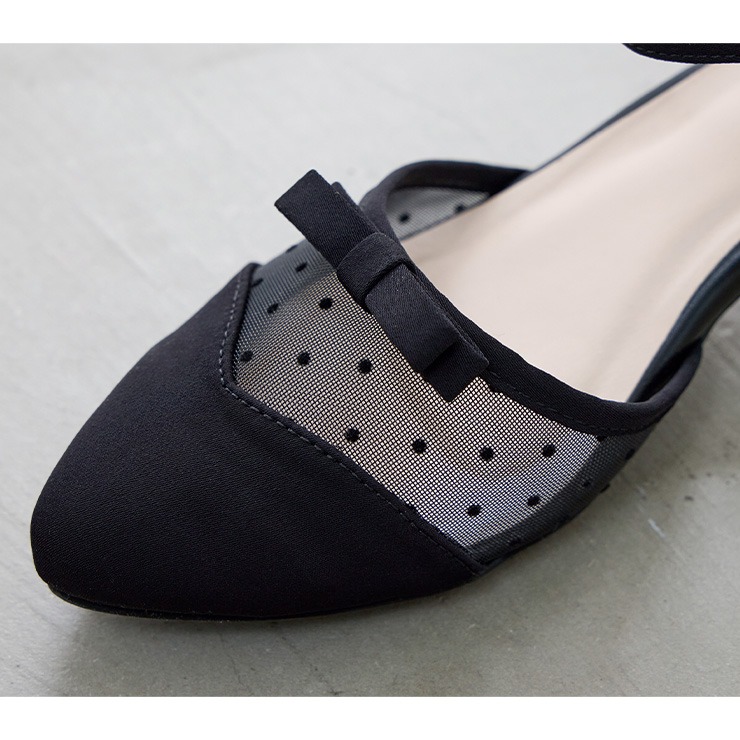 ドットチュール使いとフロントのリボンが上品さを添えるセパレートパンプスのご紹介です。