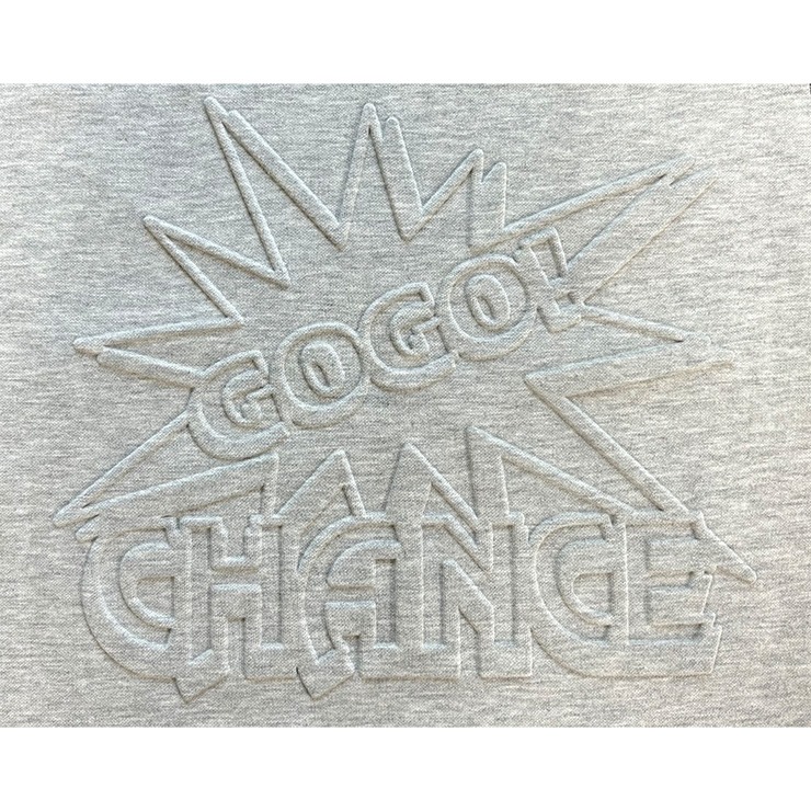 前身の定番のロゴワンポイントは刺繍、後身はインパクトのあるエンボスデザイン。