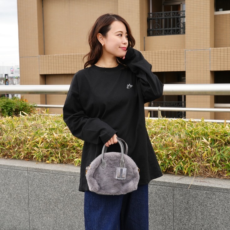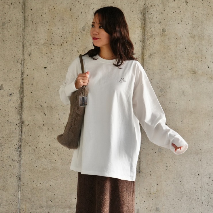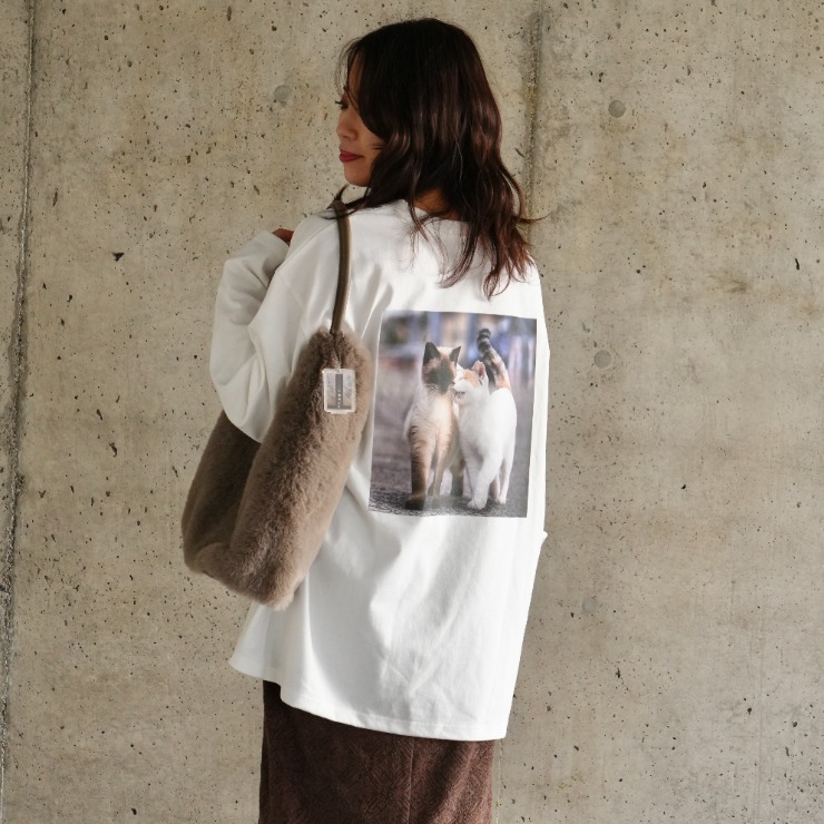 寄り添う可愛らしい猫ちゃん写真をバックプリントに、胸元には沖さんのサインロゴデザイン。