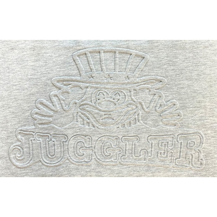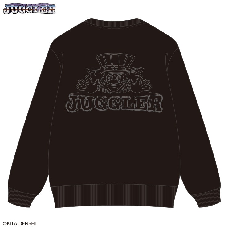 大人気!パチスロ「JUGGLER」のトレーナーが登場!前身の定番のロゴワンポイントは刺繍、後身はインパクトのあるエンボスでデザイン。ここでしか買えないコラボアイテムです!