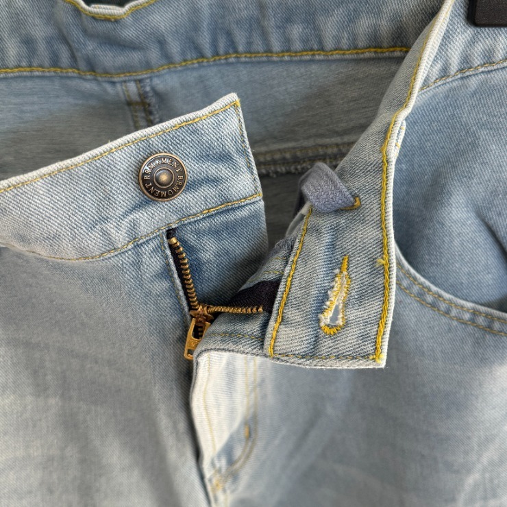 ヒゲ加工やウォッシュ加工に加え、ミニポッケにリベットをつけたり、お尻ポッケにはブランドネームを。