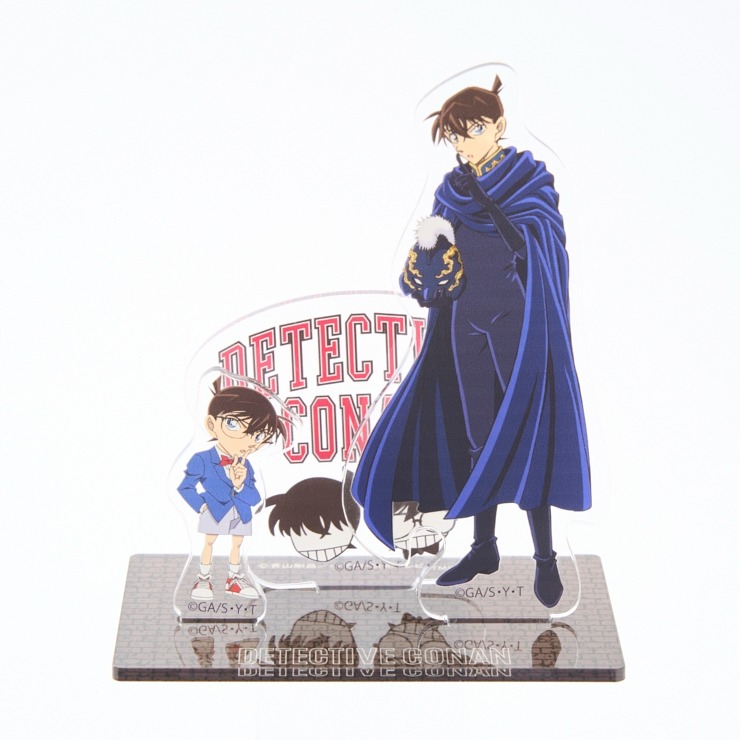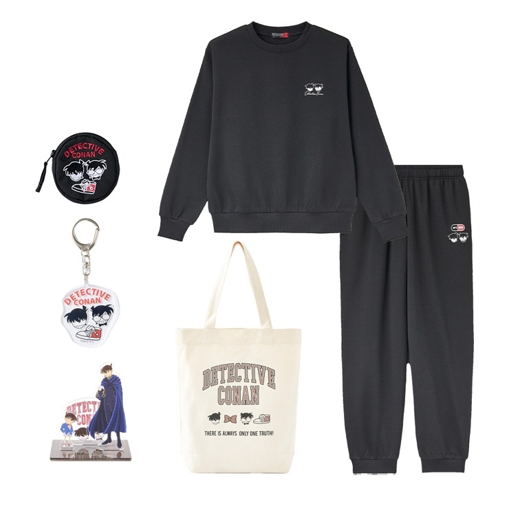 江戸川コナンと工藤新一をイメージした、トップス、ボトムス、コインケース、アクリルスタンド、アクリルキーホルダーがトートバックに入っています。