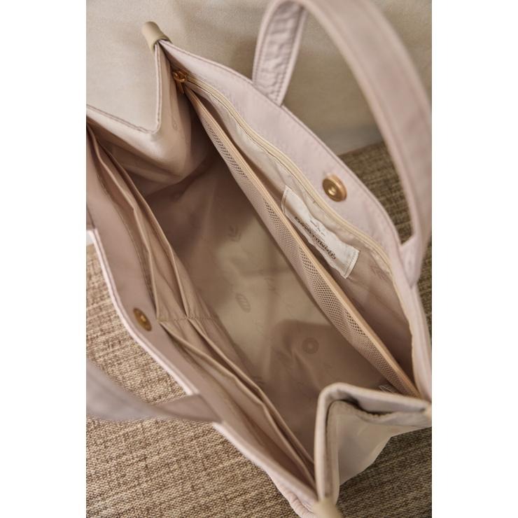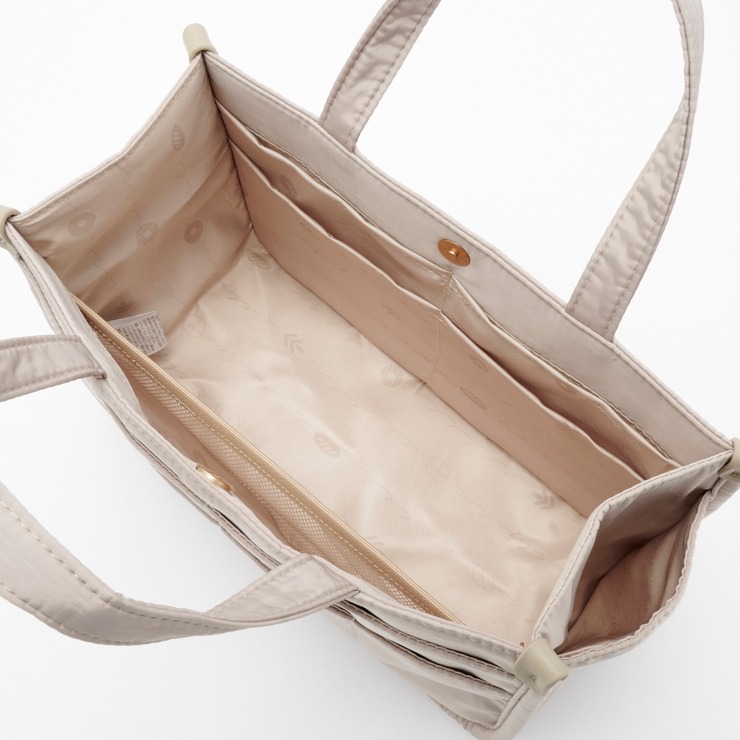 持ち手が付いているので使い勝手もよく外側にも内側にもポケットが複数ついているので細かいものの収納にぴったりです。内側のオリジナル柄の生地もかわいいポイントです。