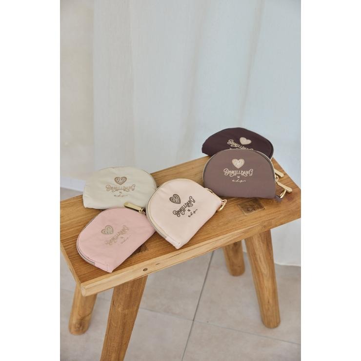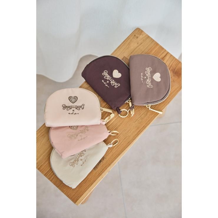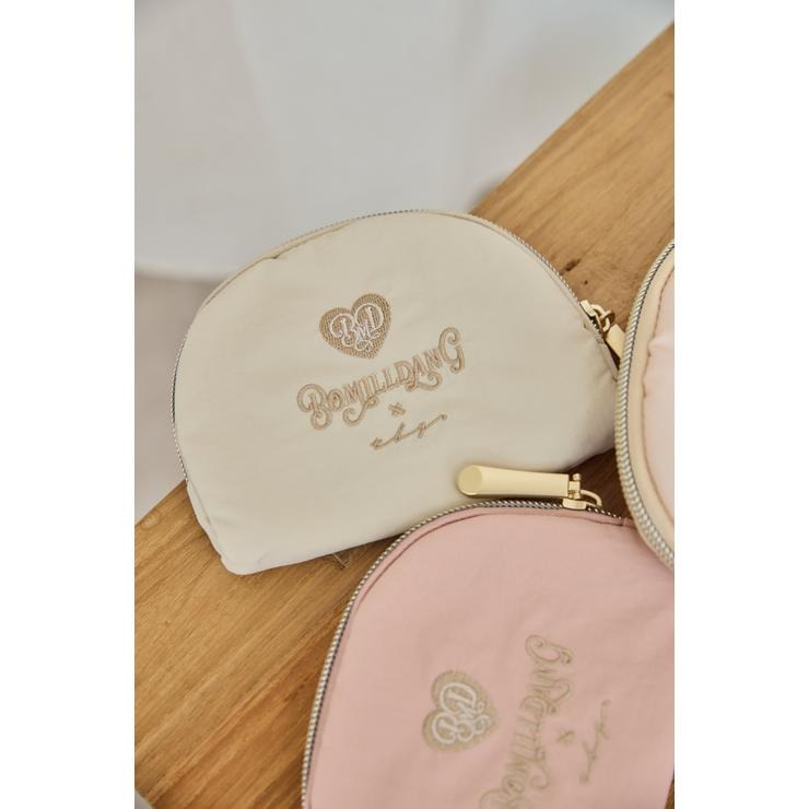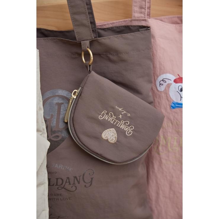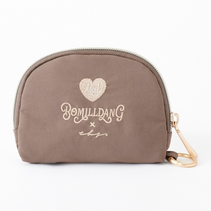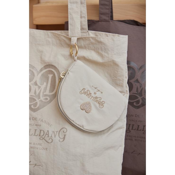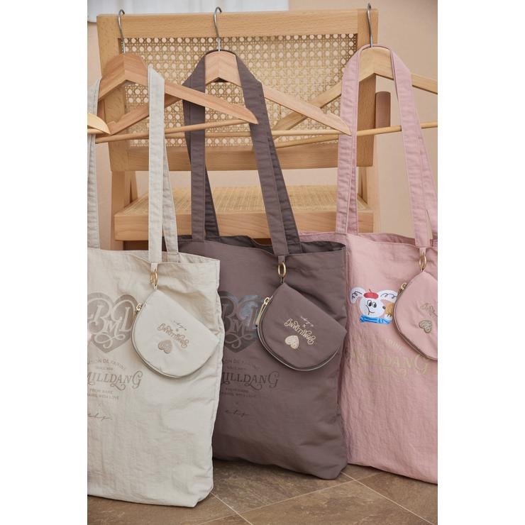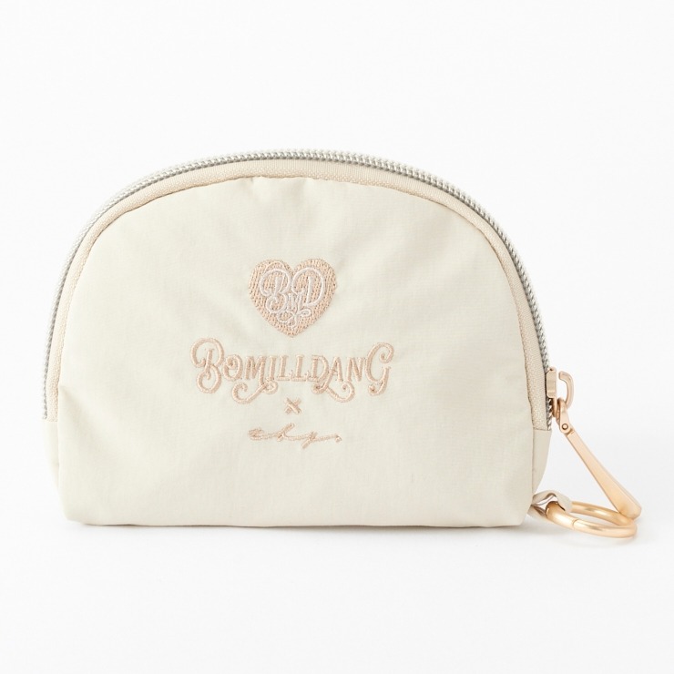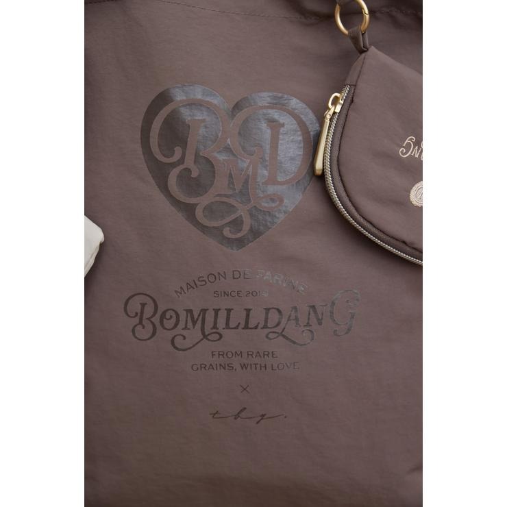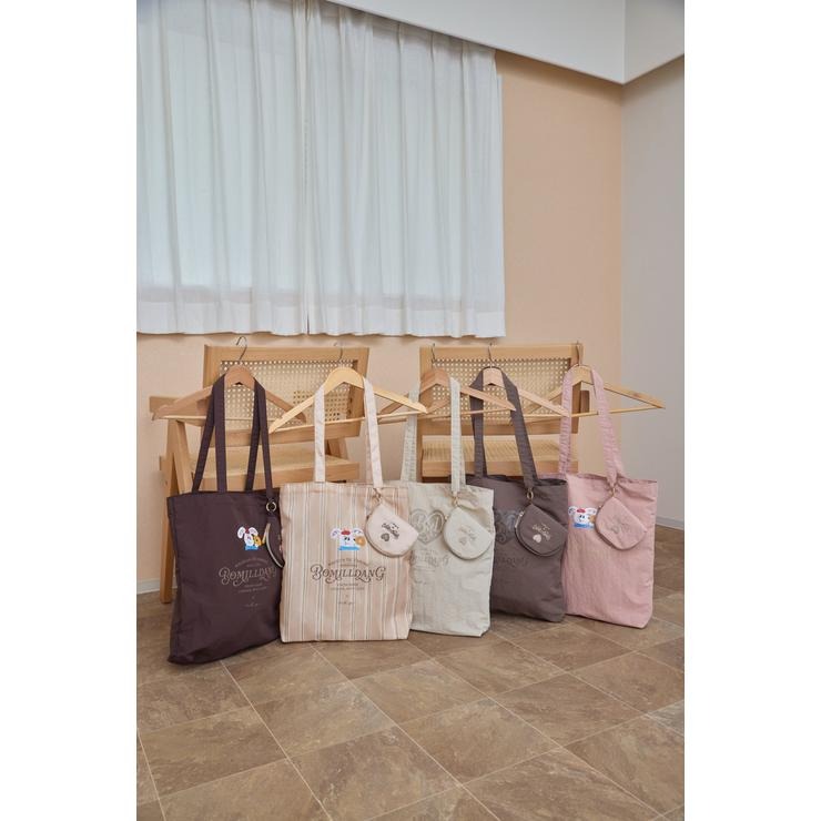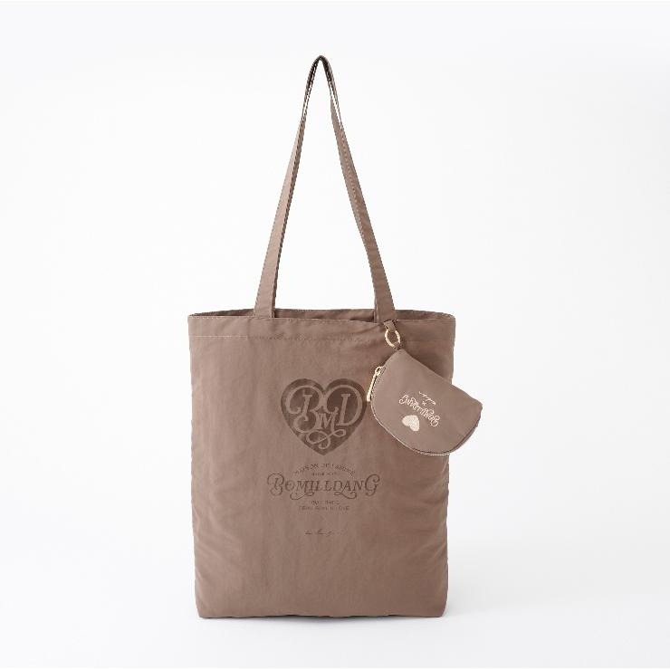 BOMILLDANGのオリジナルロゴ刺しゅうのミニポーチとトートバッグがセットになった可愛らしく実用性のあるショッピングバッグです。バッグはポーチの中に折りたたんで入れることができます。