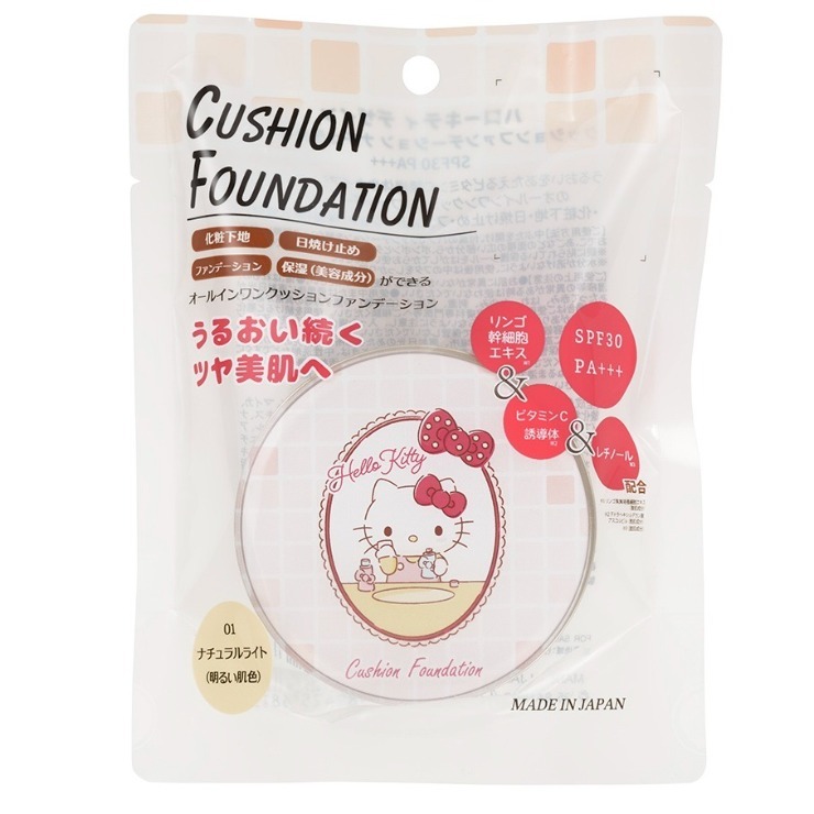 サンリオデザインで容器も可愛いクッションファンデーション。うるおいをあたえるビタミンC誘導体やナイアシンアミド配合。化粧下地・日焼け止め(SPF30 PA+++)ファンデーション・保湿の4つの機能のオールインワンタイプです。色味はナチュラルライト(明るい肌色)でパフ&ミラー付きです。