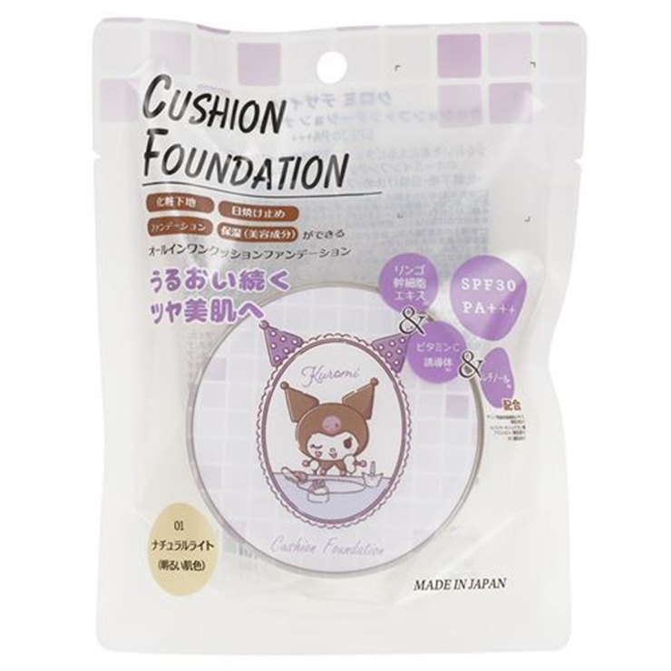 サンリオデザインで容器も可愛いクッションファンデーション。うるおいをあたえるビタミンC誘導体やナイアシンアミド配合。化粧下地・日焼け止め(SPF30 PA+++)ファンデーション・保湿の4つの機能のオールインワンタイプです。色味はナチュラルライト(明るい肌色)でパフ&ミラー付きです。