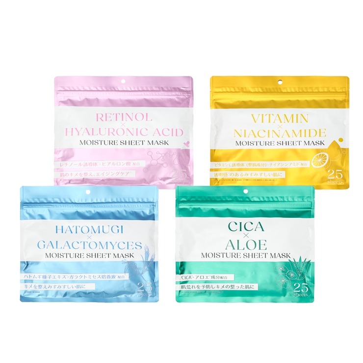 「CICA×アロエ」25枚入り、「ビタミン×ナイアシンアミド」25枚入り、「ハトムギ×ガラクトミセス」25枚入り、レチノール×ヒアルロン酸」25枚入りの計4種セット。