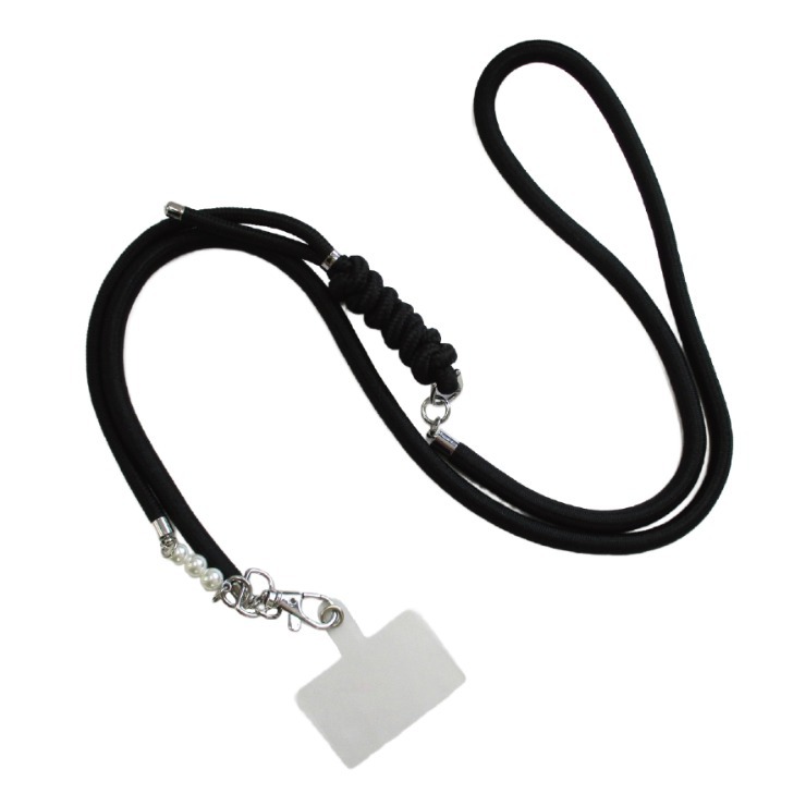 太さの異なる紐やパールをつなげたスマホショルダー。