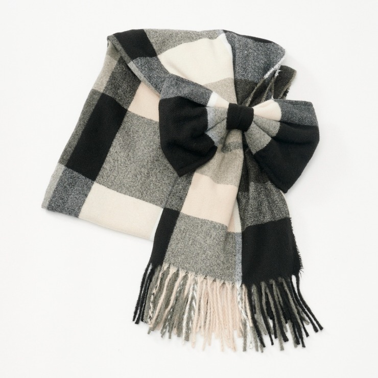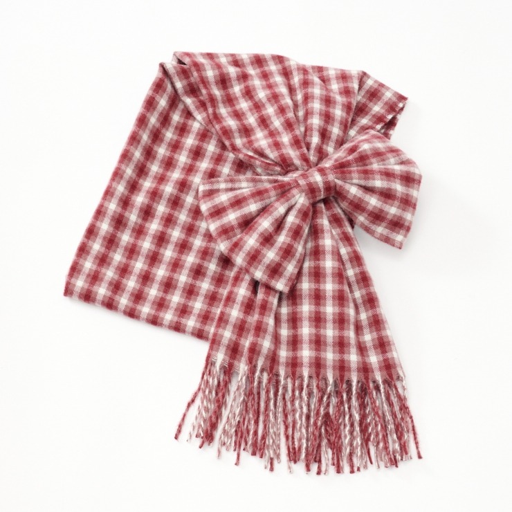 リボンのループにストールの左右をとおすだけで簡単にリボン巻きが完成。