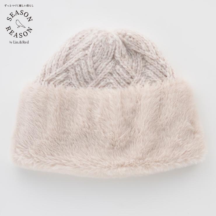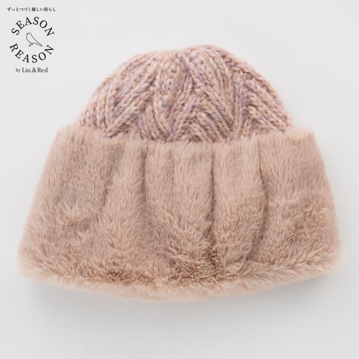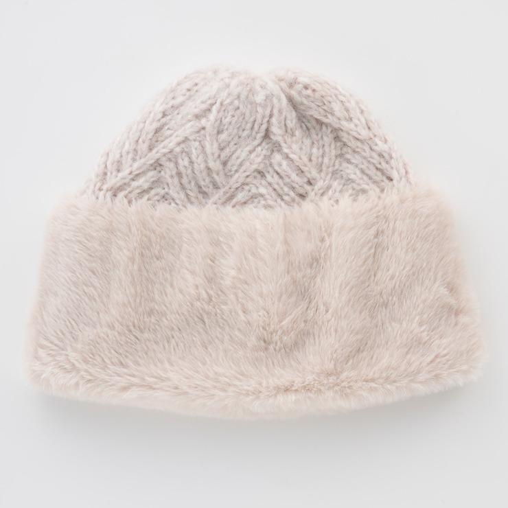 淡いミックス編みニットと起毛素材のコンビワッチです。起毛部分が大きくトーク帽っぽくかぶって頂けます。