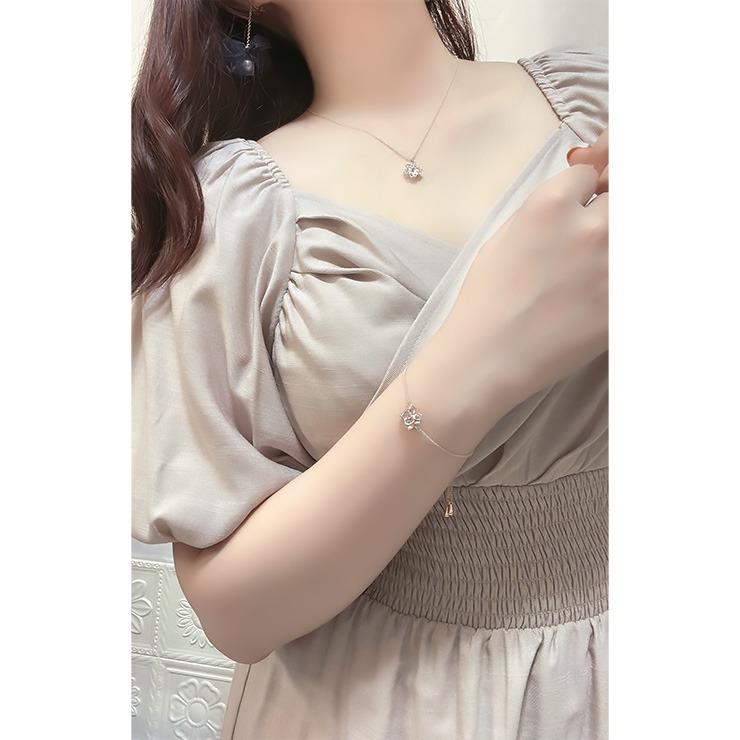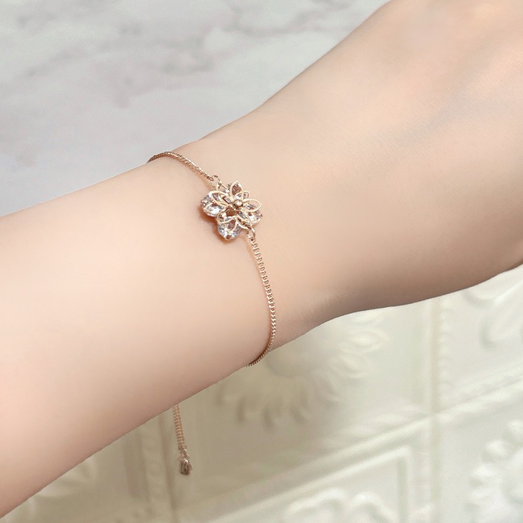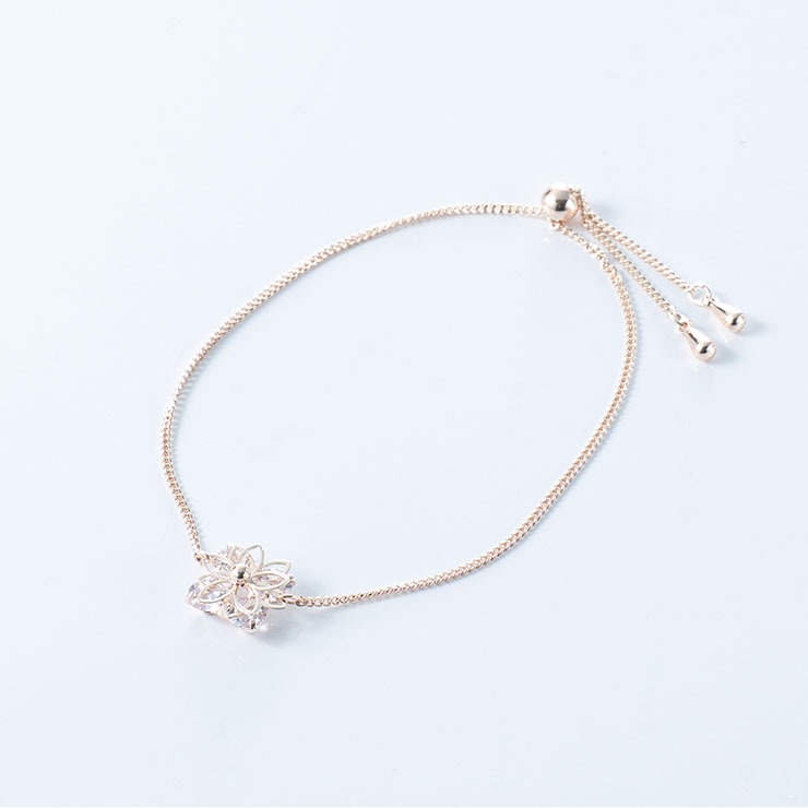 キュービックジルコニアがキラキラ輝くフラワーモチーフのブレスレット。寂しくなりがちな手元をぱっと華やかにしてくれます♪優しいピンクシルバーメッキがお肌馴染みが良い上品なカラーです!スライダーでサイズ調節が自由に出来るのも使いやすいポイントです!