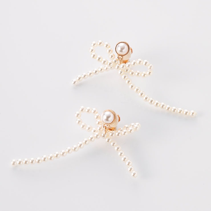 パールモチーフからパールのリボンが揺れるデザインのイヤリング。