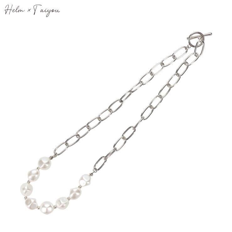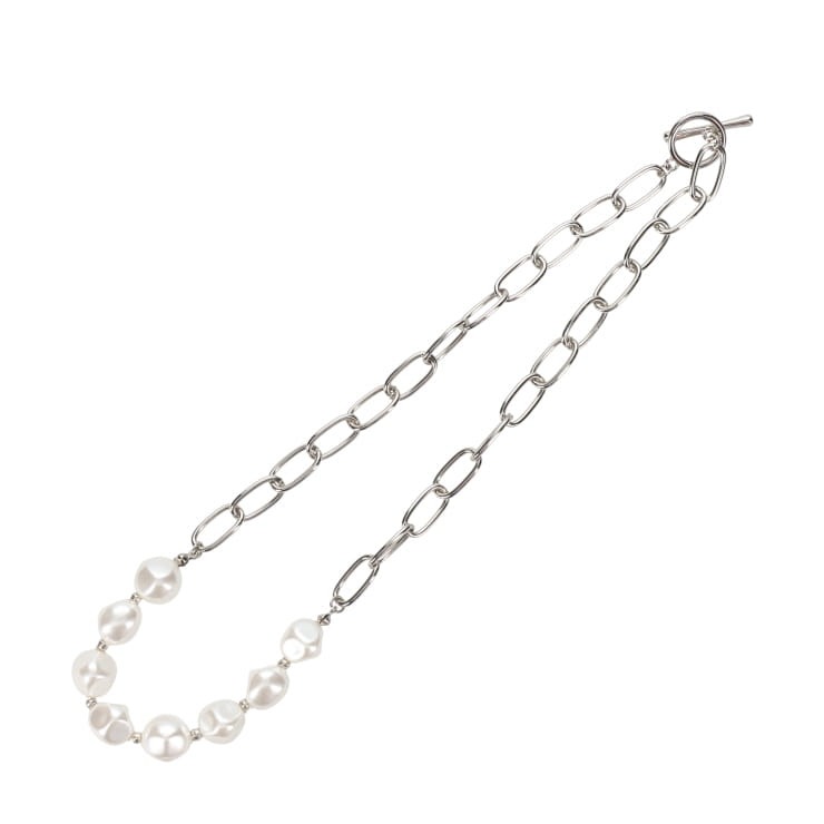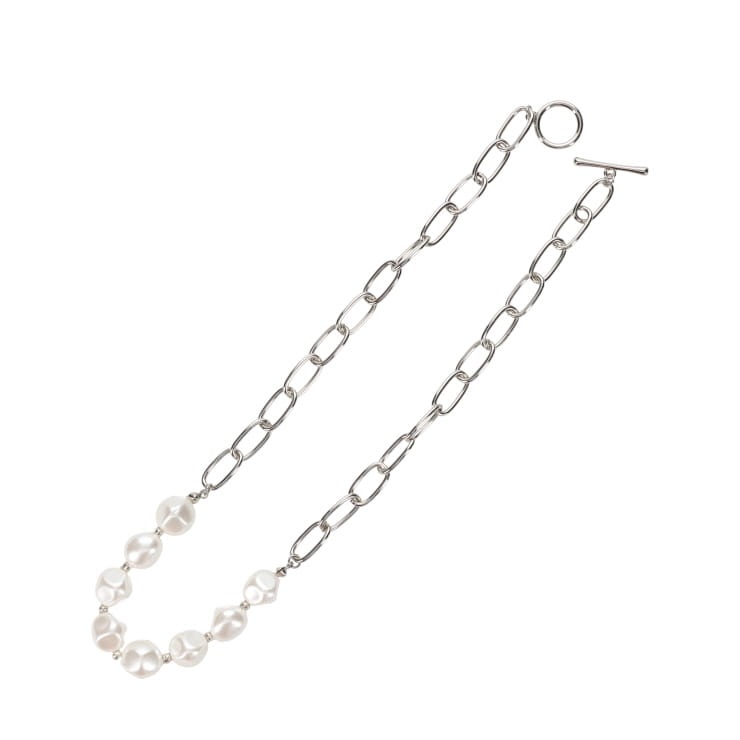 バロックパールとチェーンのマンテル金具ネックレス。パールを前にしたり、チェーンを前にしたりで違う表情を見せてくれます!マンテルバーをチェーンの途中で留めれば、Y字シルエットやチョーカーにもなる1本で色々楽しめるとっても便利なネックレスです♪