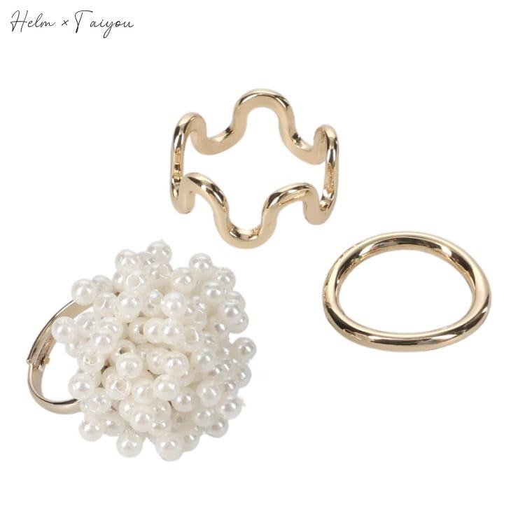 ボリュームのあるパールリングがオシャレなリング3本セット。ウェーブリングとシンプルリングをお好きに組み合わせてお使いいただけます♪