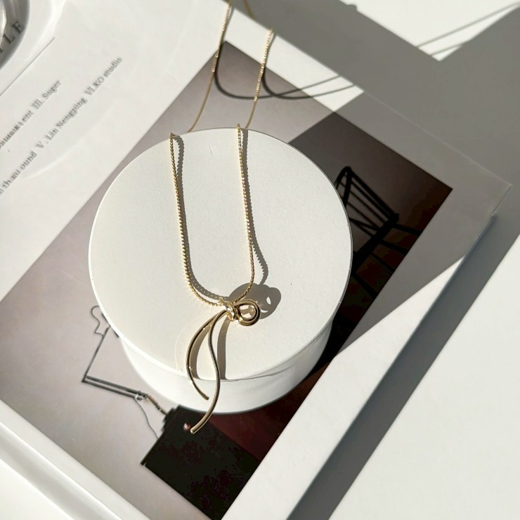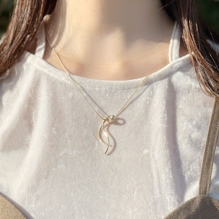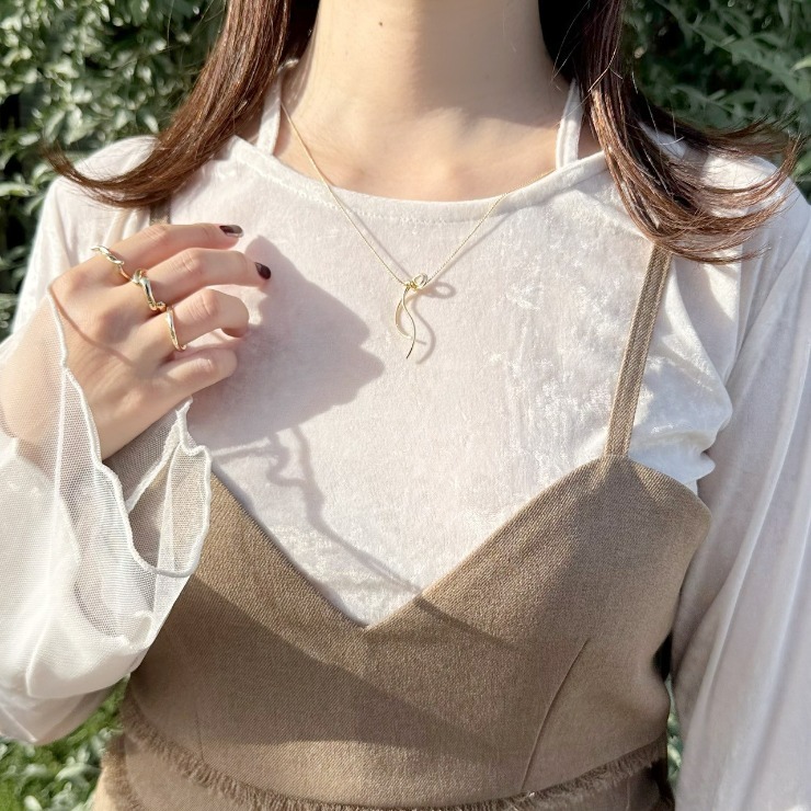 ニュアンスのある大人っぽいリボンモチーフがオシャレなネックレス。スライドアジャスター仕様なので、ロング~ショートまでお好きな長さに調節出来ます!留め金具がなく着脱がかぶるだけでストレスフリーなのも嬉しいポイントです!スライダー金具を前にすればY字ラリエットのスタイルでも楽しめる便利なネックレスです♪