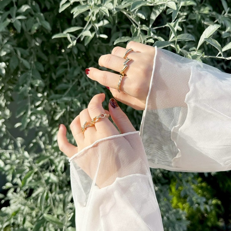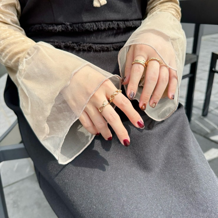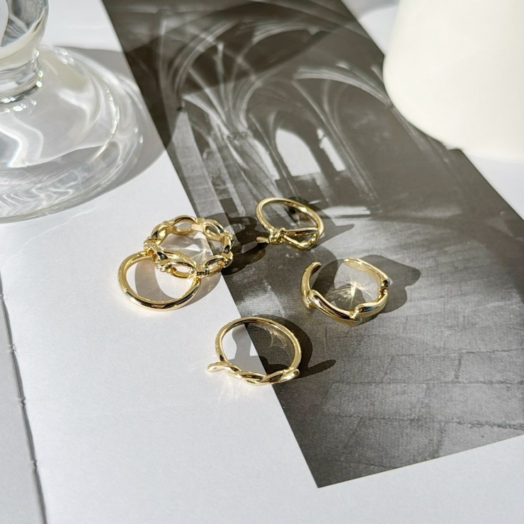 ニュアンスのあるデザインのメタルリング5本セット。セットでも1本でもお好きな組み合わせでお使いいただけるので、毎日使いたくなる便利でお得なセットリングです♪