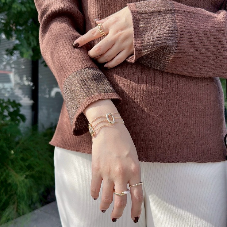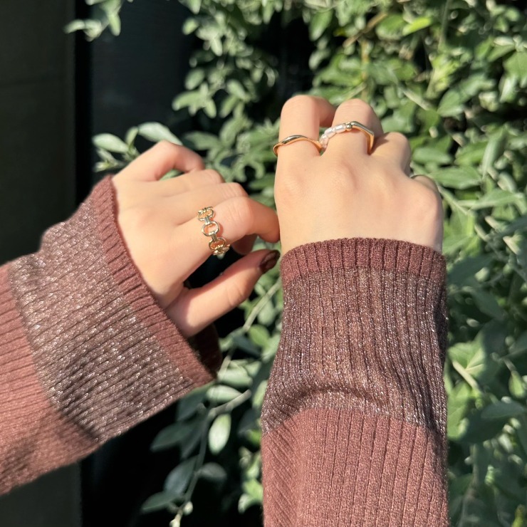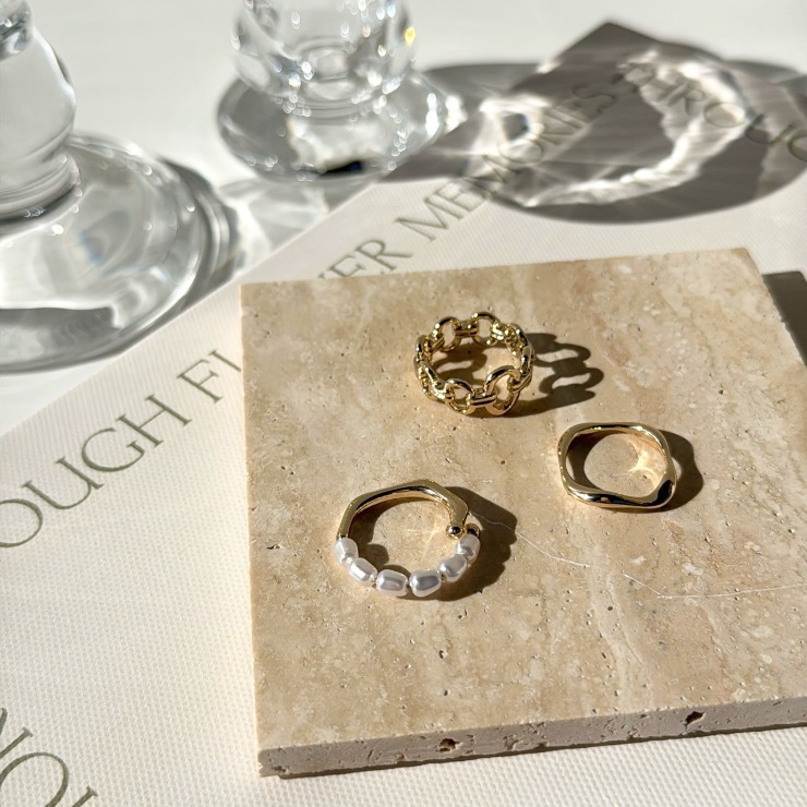 バロックパールとメタルのリング3本セット。チェーンデザインとニュアンスウェーブのオシャレなデザインです!パールリングはフリーサイズリングなので色々な指に着けられるのも嬉しいです♪