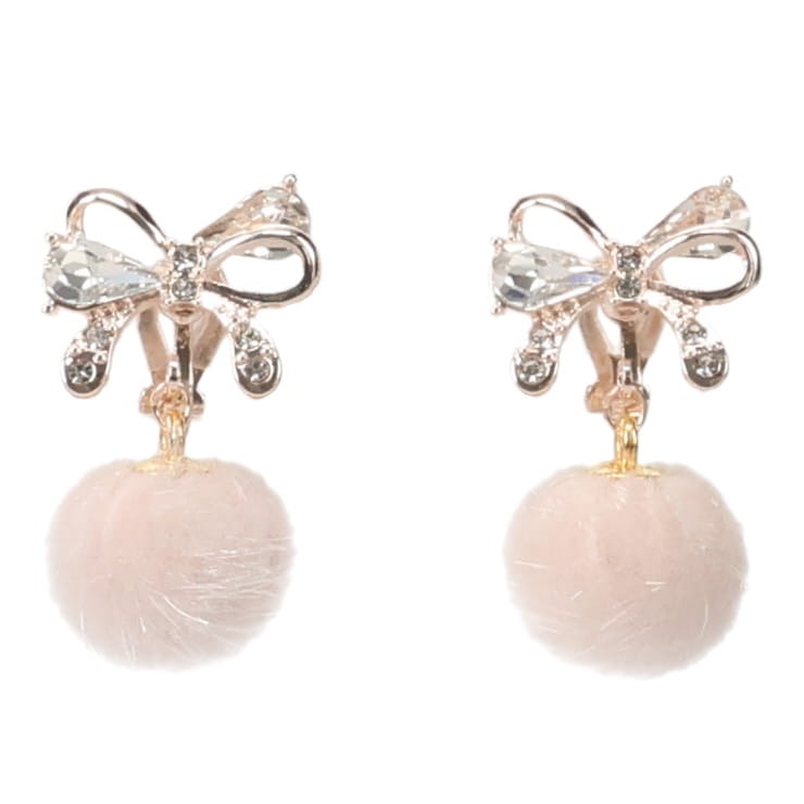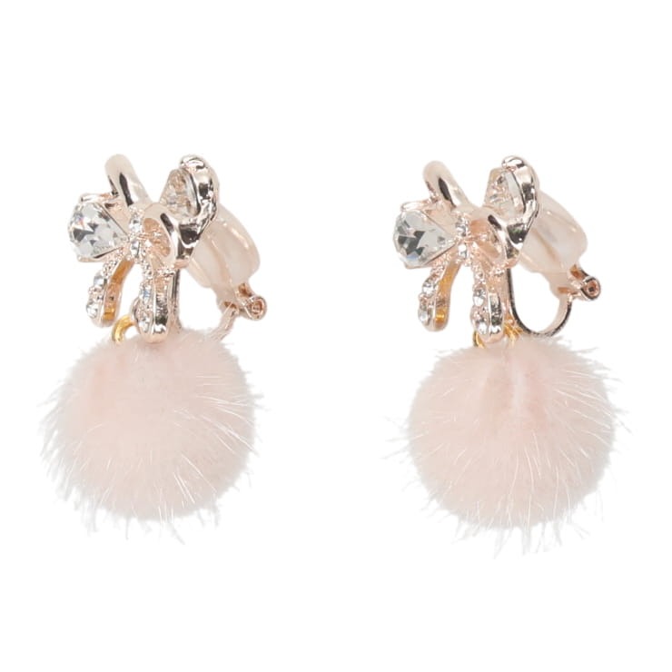 ビジューリボンとふわふわのボール型イヤリング。