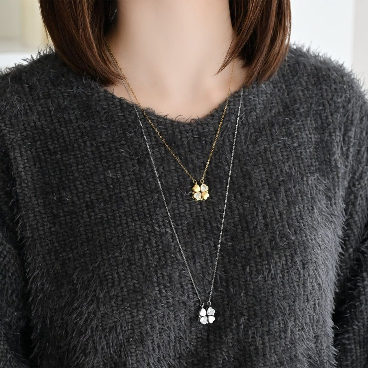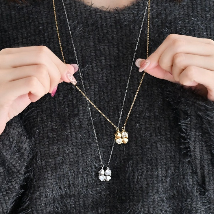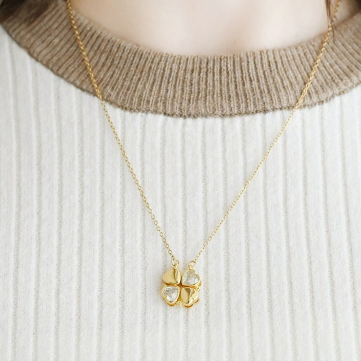 ハートパーツを集めたクローバートップのネックレス。ハートパーツの両端にマグネットが付いて、閉じた状態では幸運のクローバー、開いた状態ではハートペンダントになる2WAYで楽しめるネックレスです♪大粒のハートキュービックジルコニアの高級感のある輝きが目を引きます!コーディネートに合わせて長さをスライダーボールでロングからショートに調節出来るのでとっても便利です。