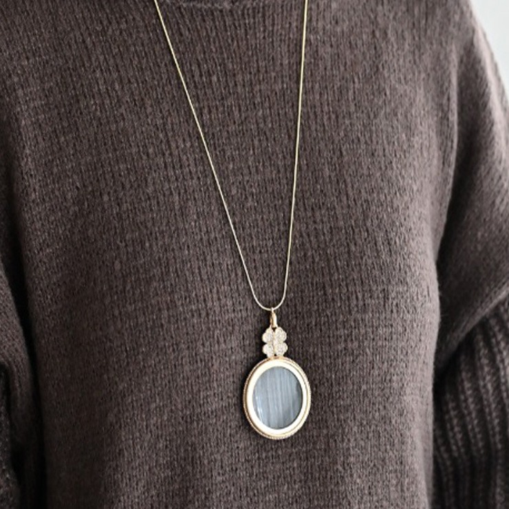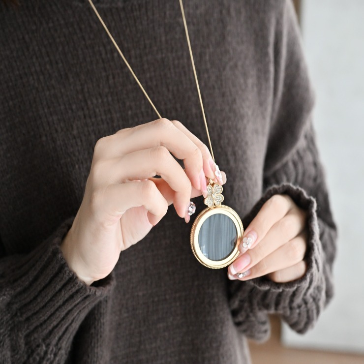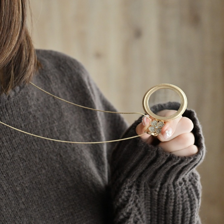 人気の幸運のクローバーモチーフで、キラキラ輝くパヴェストーンとシックなメタルのリバーシブルで気分に合わせて両面楽しめます♪開閉バチカン金具なのでルーペを取り外してもお使いいただけ、お出掛け先でサッと使えるのがとっても便利です!チェーンはスライダー仕様で長さを自由に調節出来て、留め金具がなく着脱も簡単でストレスフリーです!