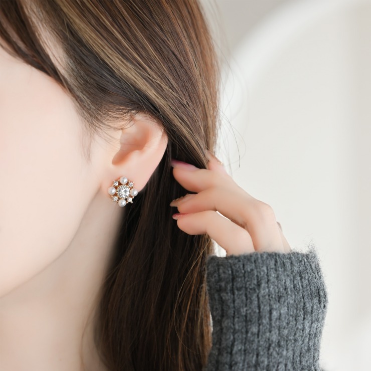 パールとストーンがキラキラ輝くビジューイヤリング。小振りなサイズでどんなコーディネートにも合わせやすい毎日使いたくなるデザインです♪