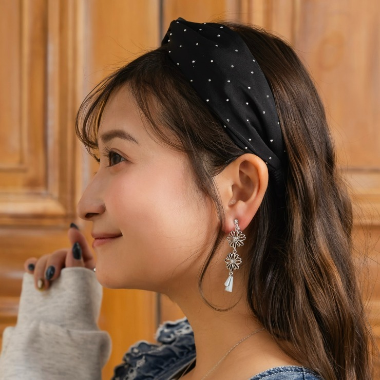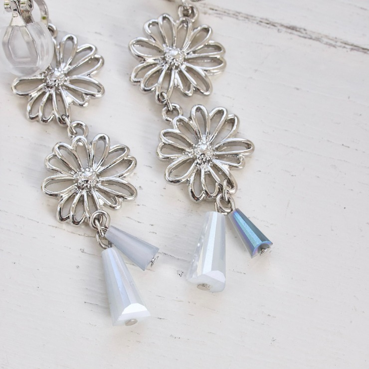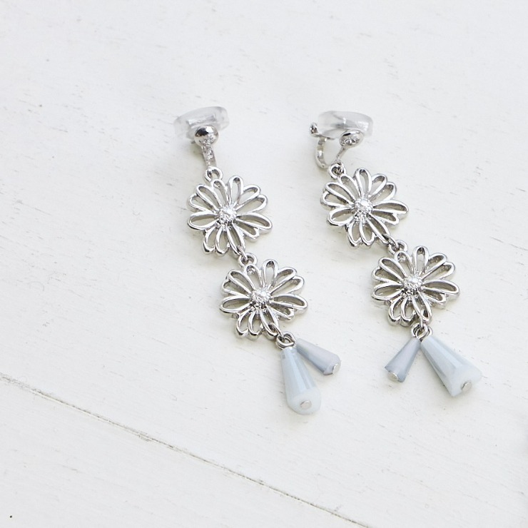 春を先取り出来るメタルフラワーイヤリング。フラワーなのに甘くなりすぎないデザインとシルバーカラーで辛口なデザインに仕上げました♪オシャレなニュアンスカラーのガラスが耳元でゆらゆら揺れて、お顔周りをぱっと華やかにしてくれます!