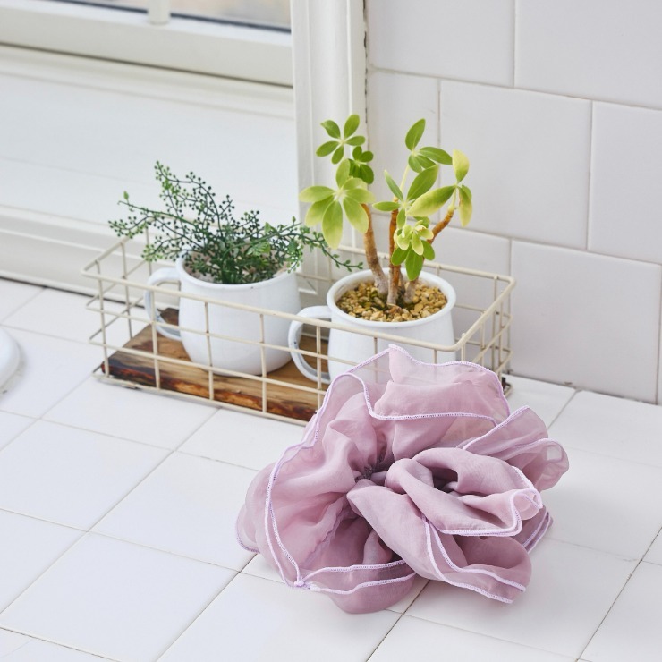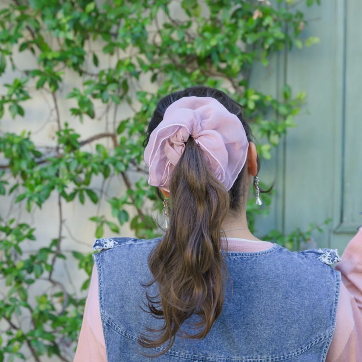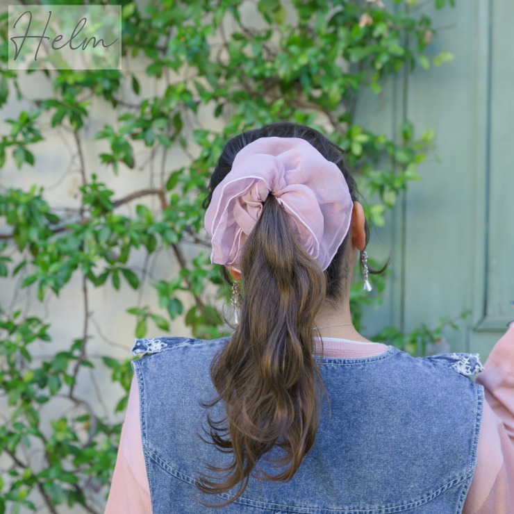 オーガンジーのシアービッグシュシュ。くすんだピンクのニュアンスカラーにパイピング加工で大人可愛いデザインに仕上げました♪いつものヘアスタイルにプラスするだけで、簡単にオシャレにしてくれるトレンドアイテムです!