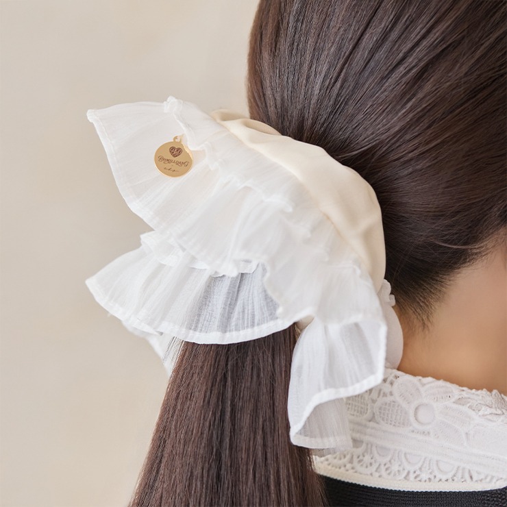 幅広のレースがおしゃれなシュシュ。オリジナルプレートがポイント♪