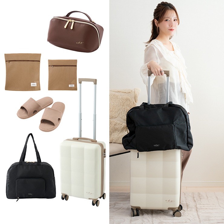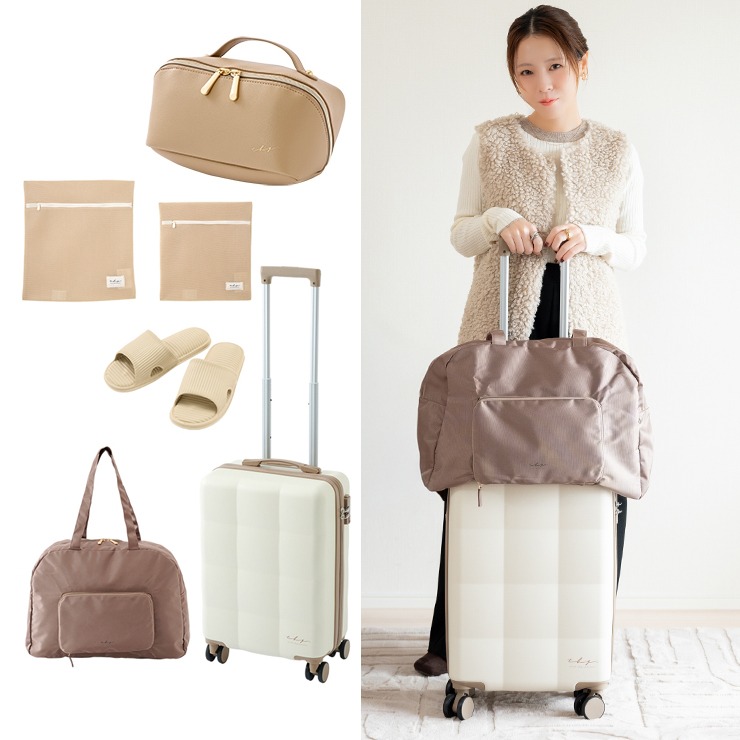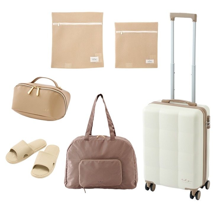 ぷっくりデザインが目を惹くキャリーケースに、旅行などにぴったりな、パッカブルバッグ・ポーチ・巾着付きサンダル・トラベルポーチが入ったお得な5点セットです♪