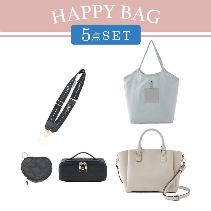 合皮バッグ、キルトポーチ、サブバッグ、スマホショルダーストラップ、ポーチチャームの5点セットです。
