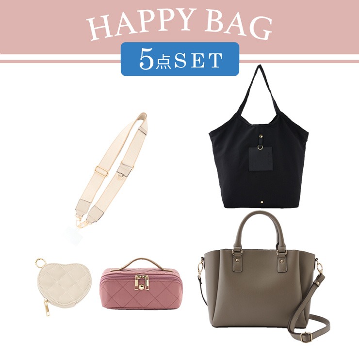 合皮バッグ、キルトポーチ、サブバッグ、スマホショルダーストラップ、ポーチチャームの5点セットです。
