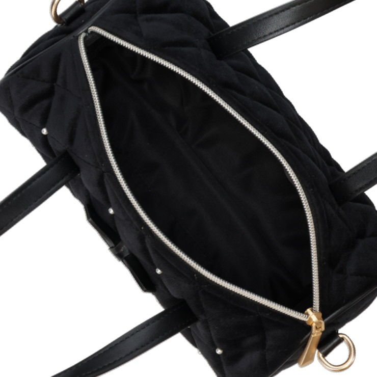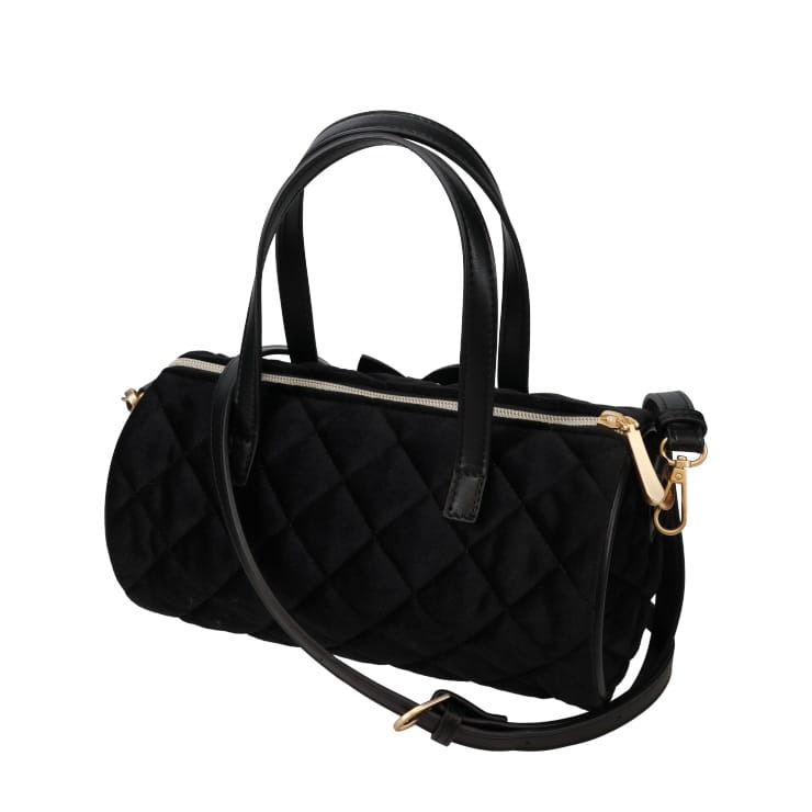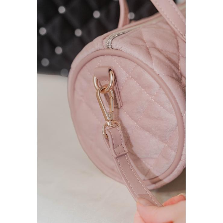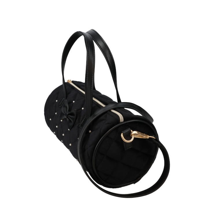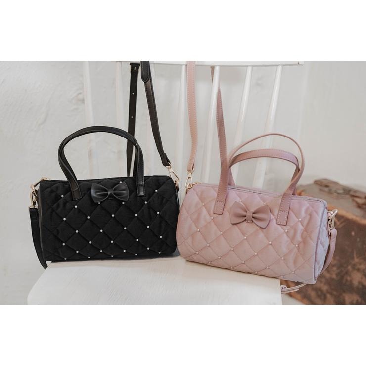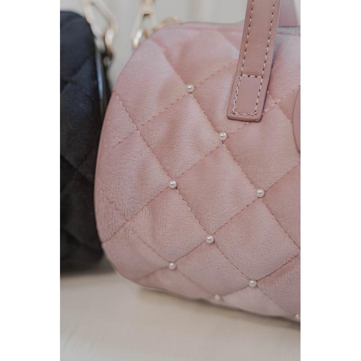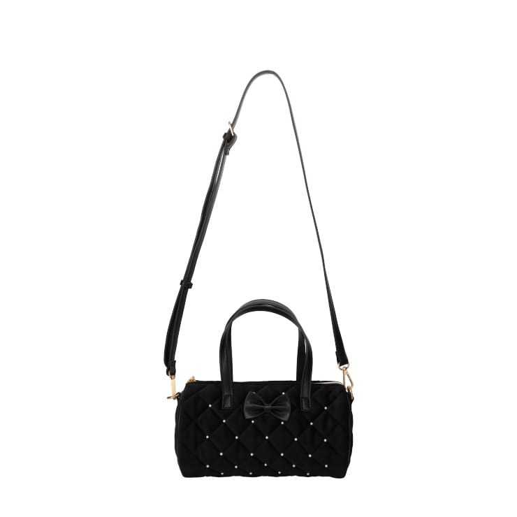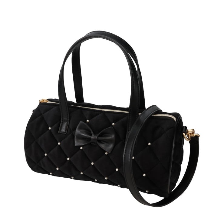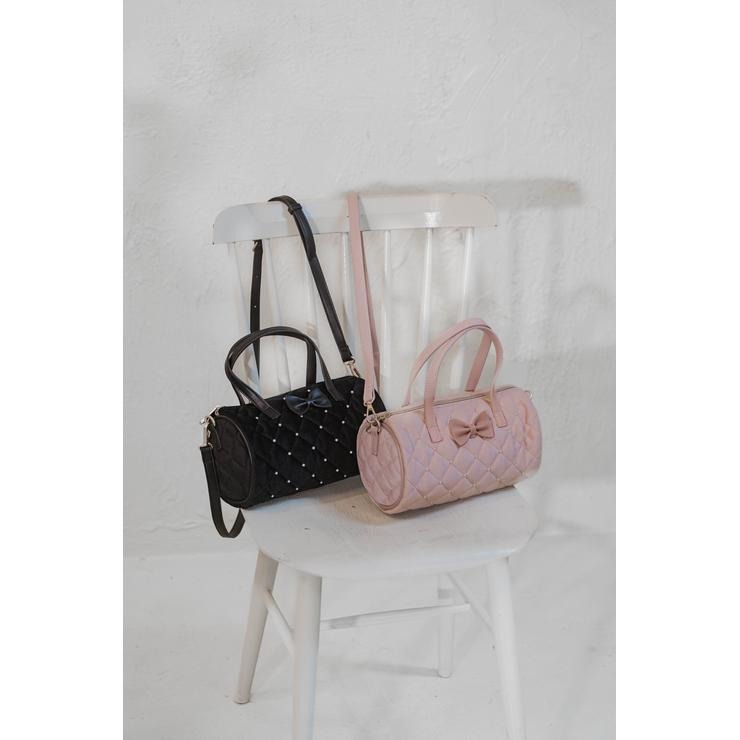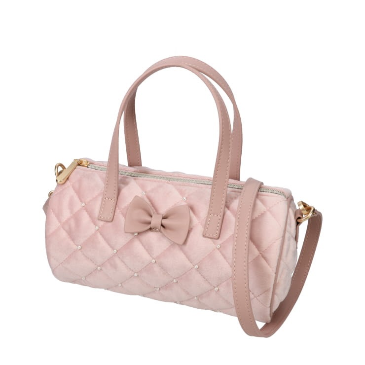 ベロア生地にパールとリボンがポイントのロールボストンバッグです。