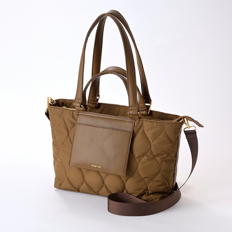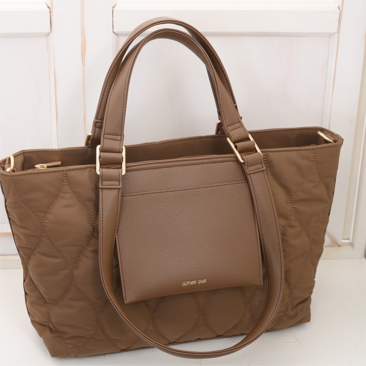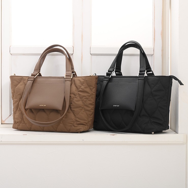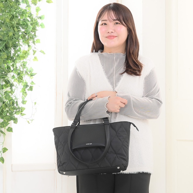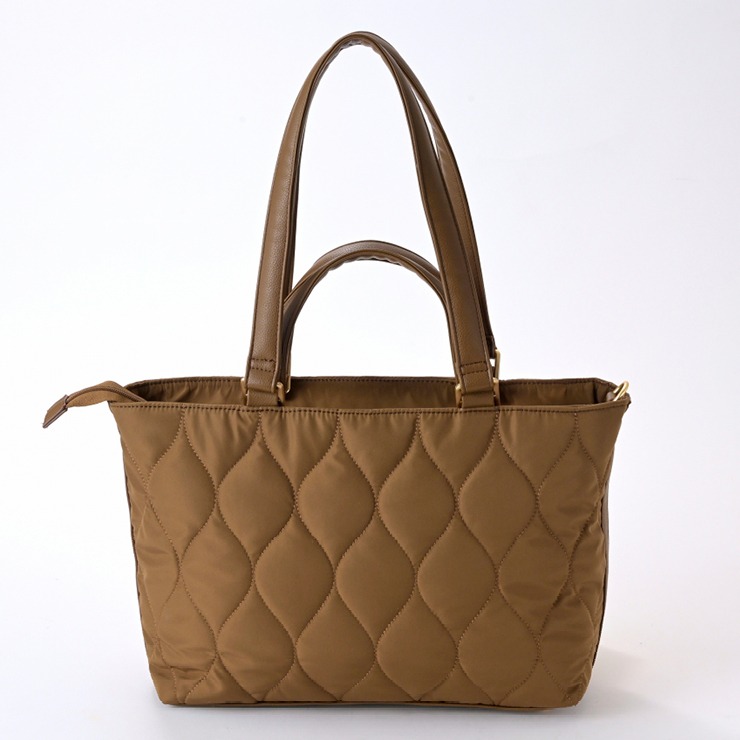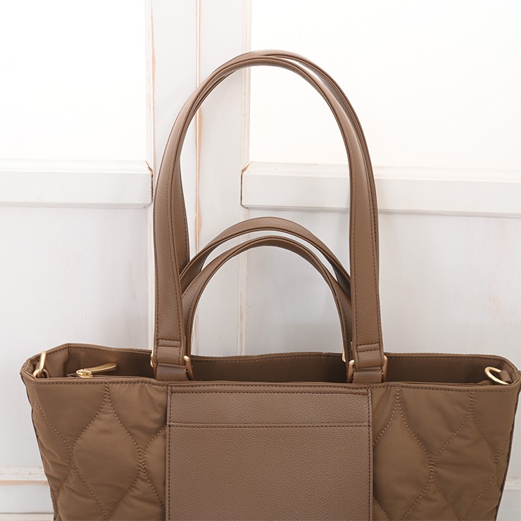 短い持ち手、長い持ち手、調整金具付きショルダーの3種類を便利に使い分けて持つことができるキルティングデザインが目を惹くトートバッグです。前面にはオリジナルのロゴが箔押しされた合皮素材のポケットで上品な雰囲気に♪