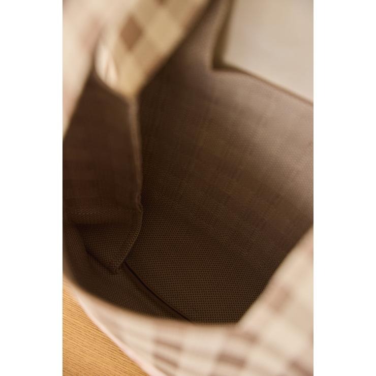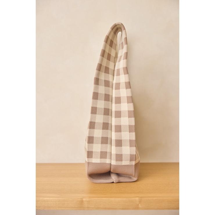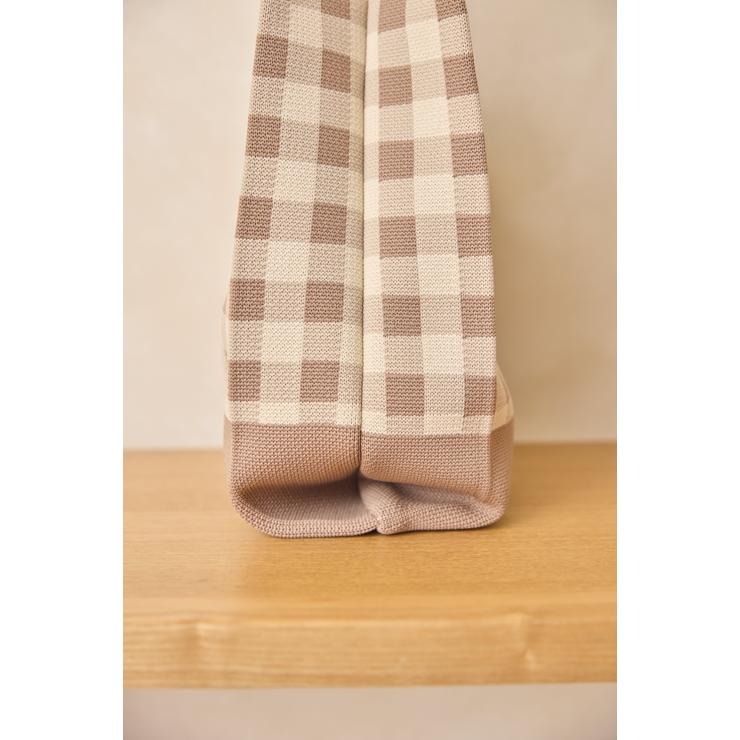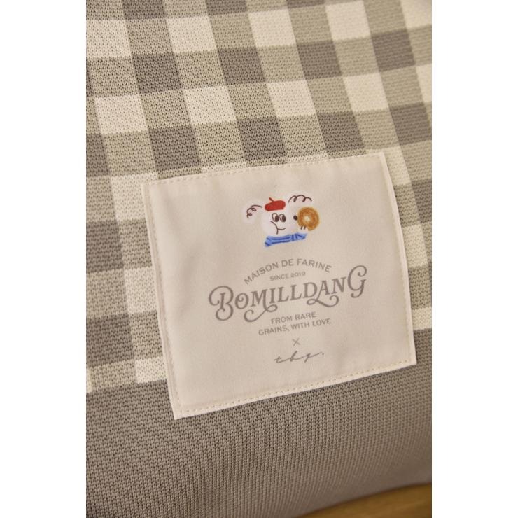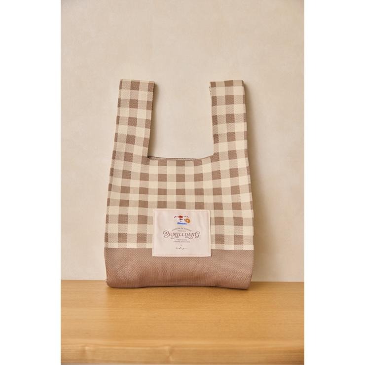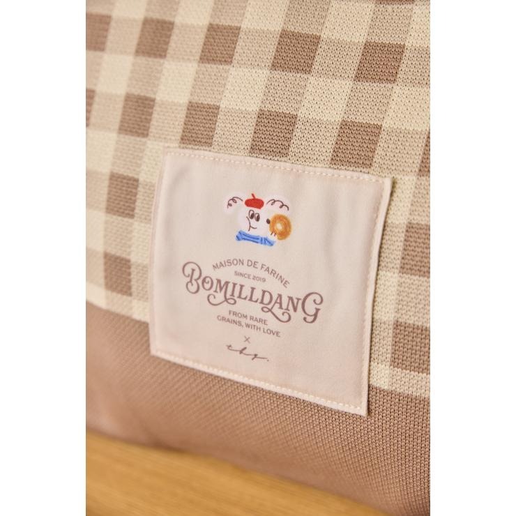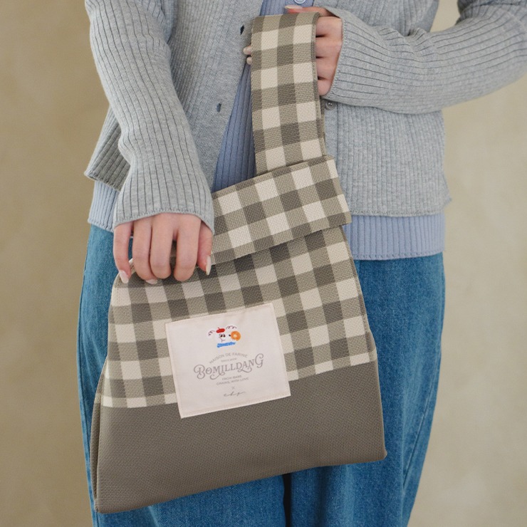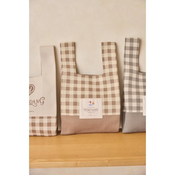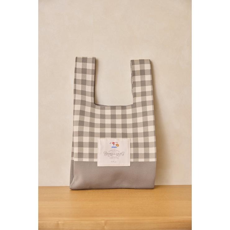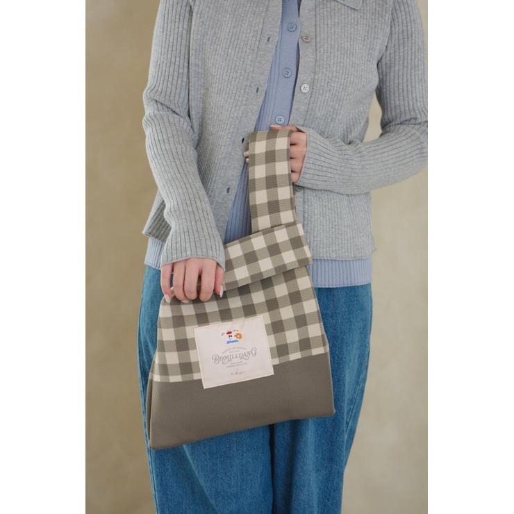 しっかりとしたニット素材で仕立てられたバッグ。チェック柄と無地の絶妙なコンビネーションが魅力的で、BOMILLDANGのオリジナルロゴワッペンが可愛さを引き立てます。丈夫で使いやすく、日常のおしゃれにぴったりなアイテムです。