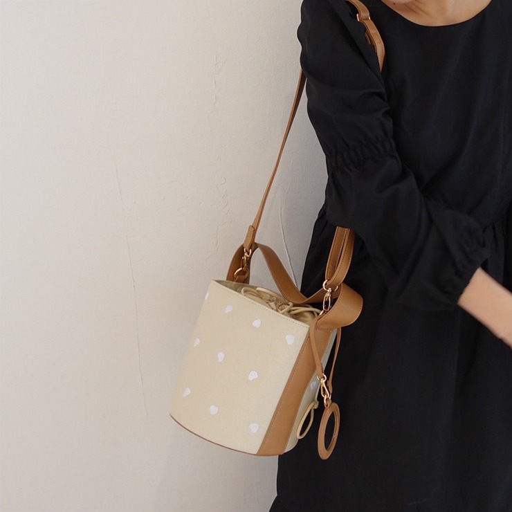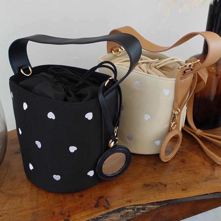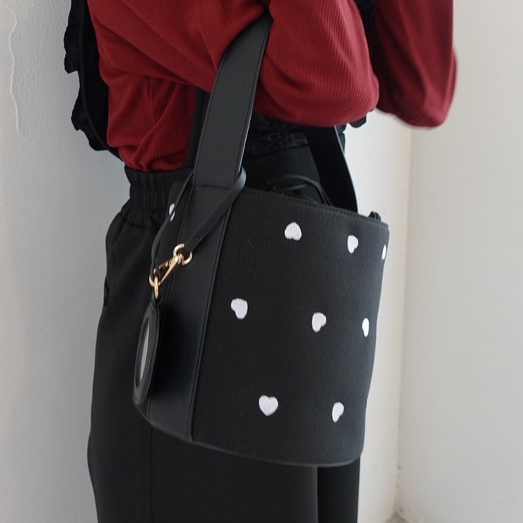 ハート柄の刺繍が散りばめられたバケツ型のバッグです