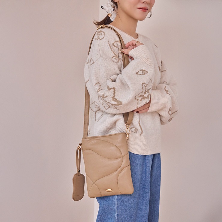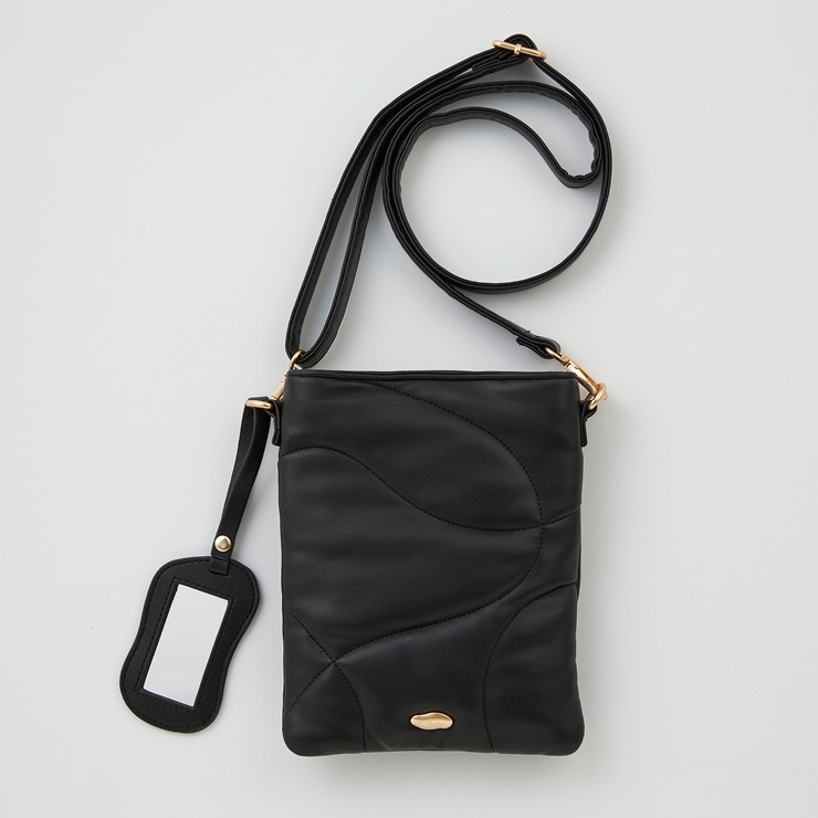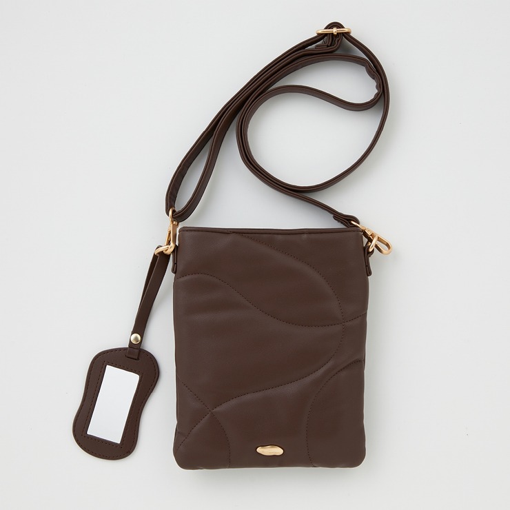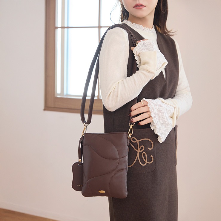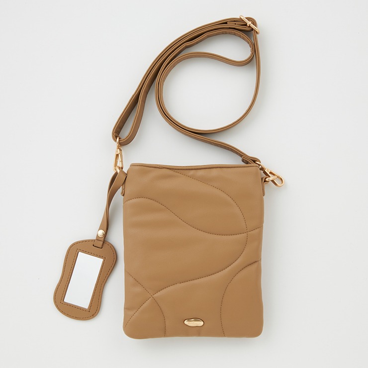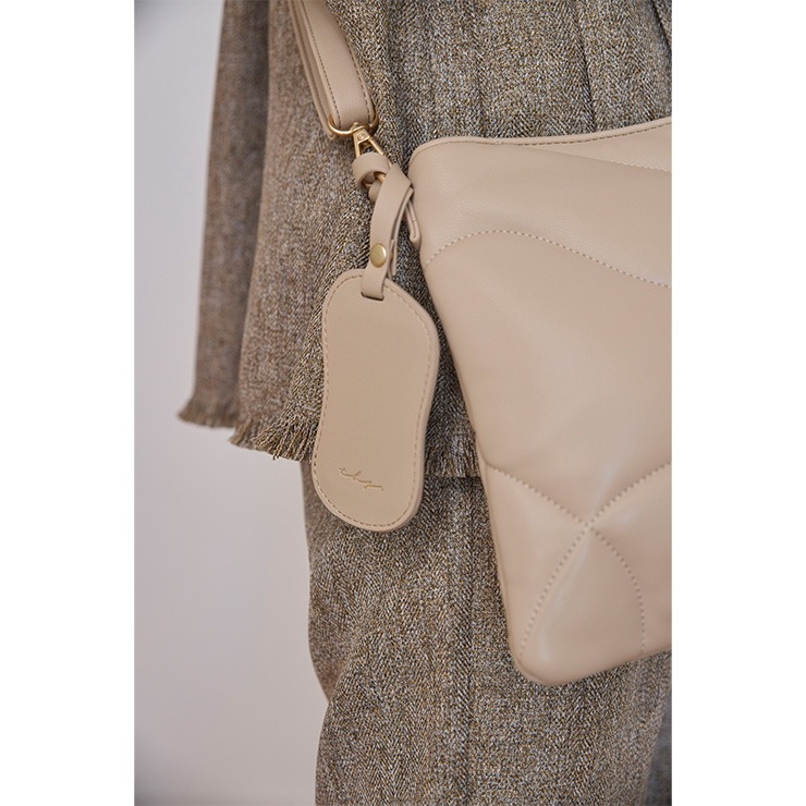 柔らかい合皮素材のキルティングが高見えし、ちょっとしたお出かけにもぴったり♪付属のミラーチャームやロゴのプレートが目を惹き幅広いコーディネートに合わせやすいショルダーバッグです♪