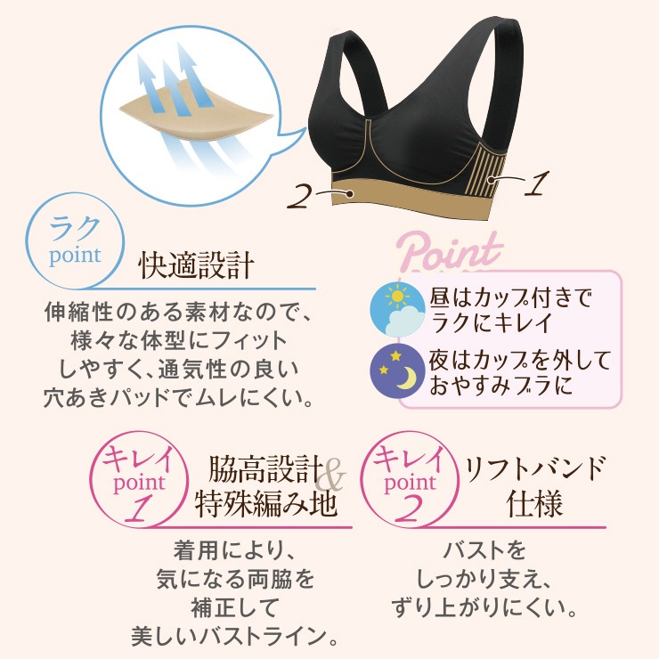 昼はカップ付きでラクにキレイ。夜はカップを外しておやすみブラとしても使用できる、ハーフトップです♫
