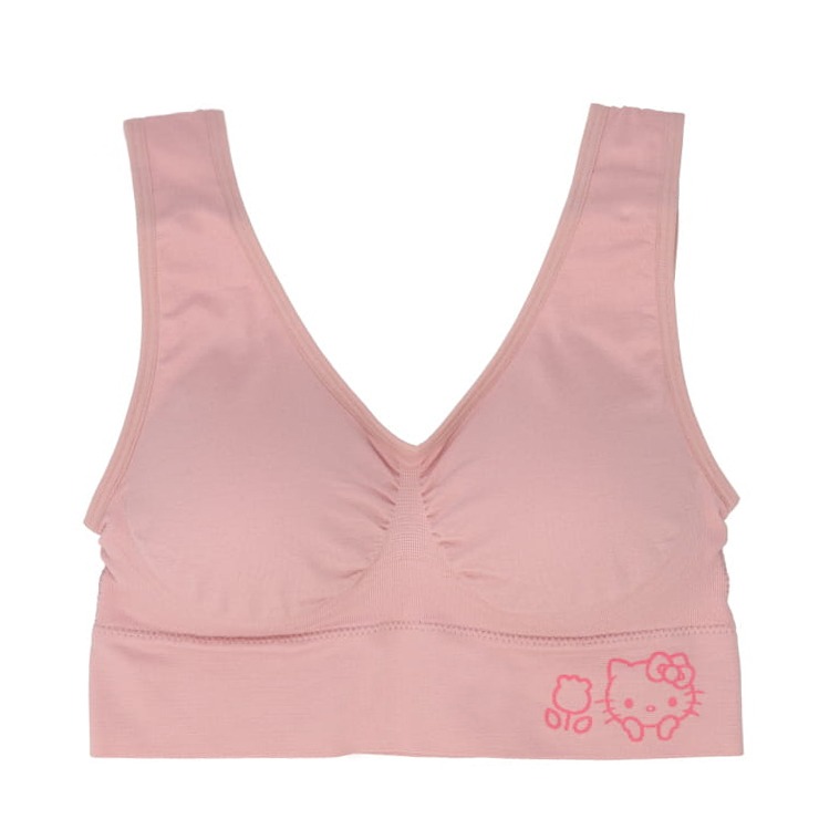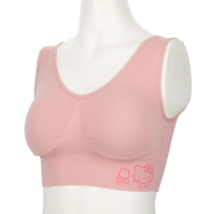 サンリオキャラクターズのコラボのハーフトップブラが新登場。伸縮性のある素材なので、様々な体型にフィットしやすく、通気性の良い穴あきパットでムレにくい。脇高設計&特殊編みを採用し、着用による気になる両脇を補正して美しいバストライン。ベルト部分のロゴのキャラクターが可愛い!