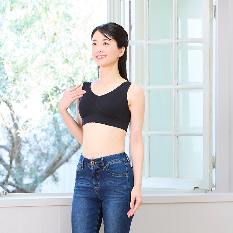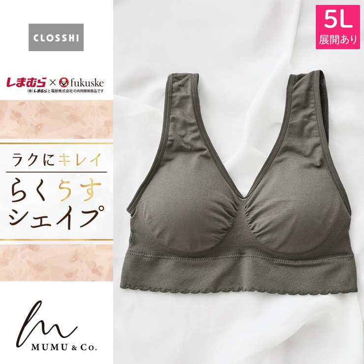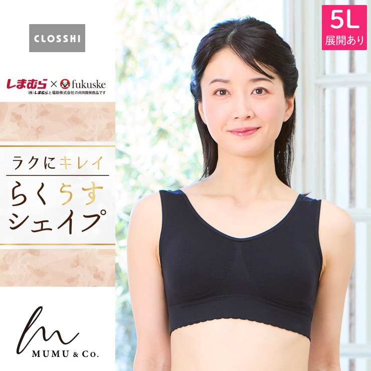MUMUさんとラクにキレイらくうすシェイプのコラボ商品が新登場。伸縮性のある素材なので、様々な体型にフィットしやすく、通気性の良い穴あきパットでムレにくい。脇高設計&特殊編みを採用し、着用による気になる両脇を補正して美しいバストライン。昼はカップ付きでラクにキレイに、夜はカップを外しておやすみブラに使えます。裾部分はMUMUさんオリジナルデザインになっています。