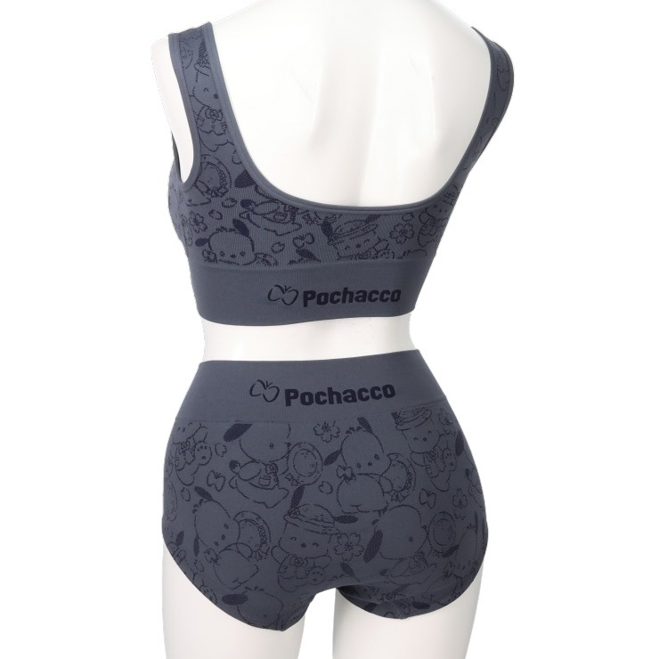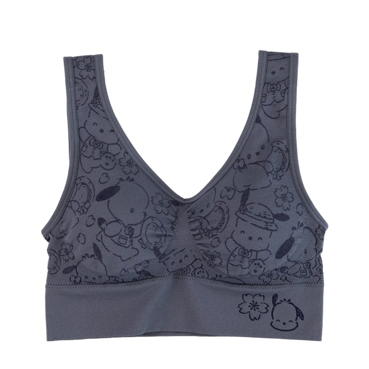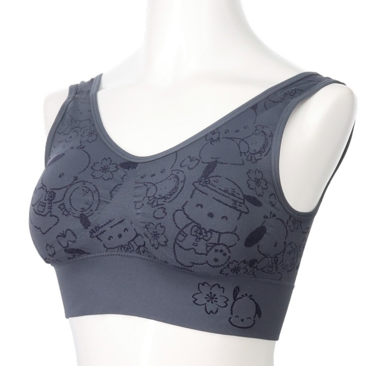 サンリオキャラクターズのコラボのハーフトップブラが新登場。伸縮性のある素材なので、様々な体型にフィットしやすく、通気性の良い穴あきパットでムレにくい。脇高設計&特殊編みを採用し、着用による気になる両脇を補正して美しいバストライン。総柄のキャラクターが可愛い!