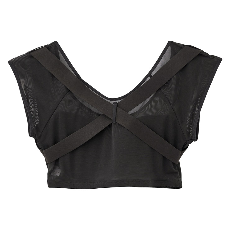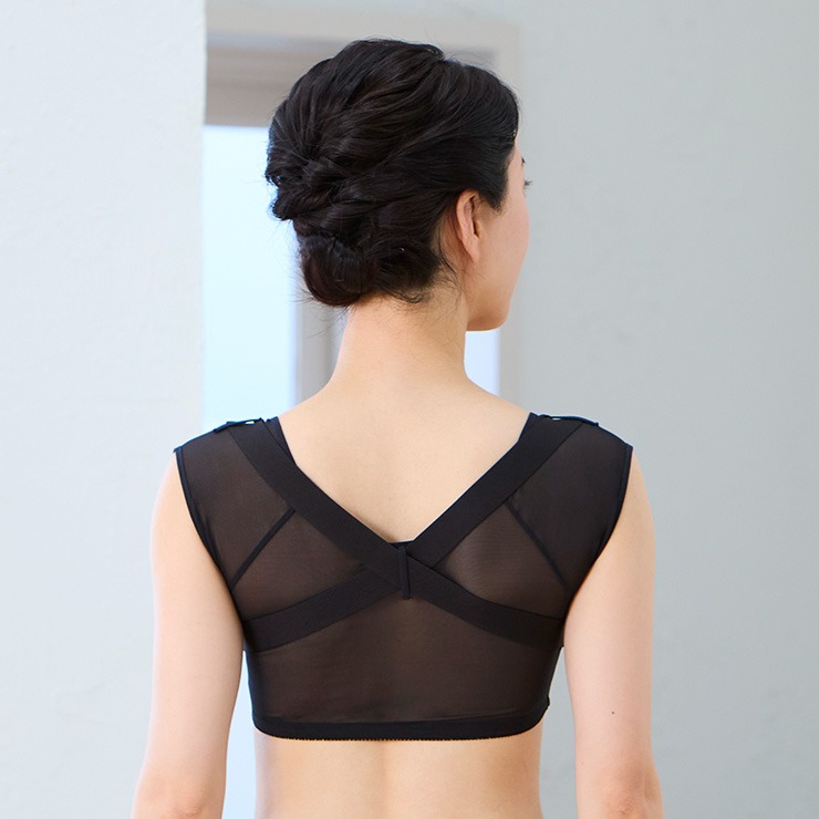 背中のクロステープが肩甲骨を”ぐっと”引き寄せて、 内に入った肩を後ろへサポート。※着用時